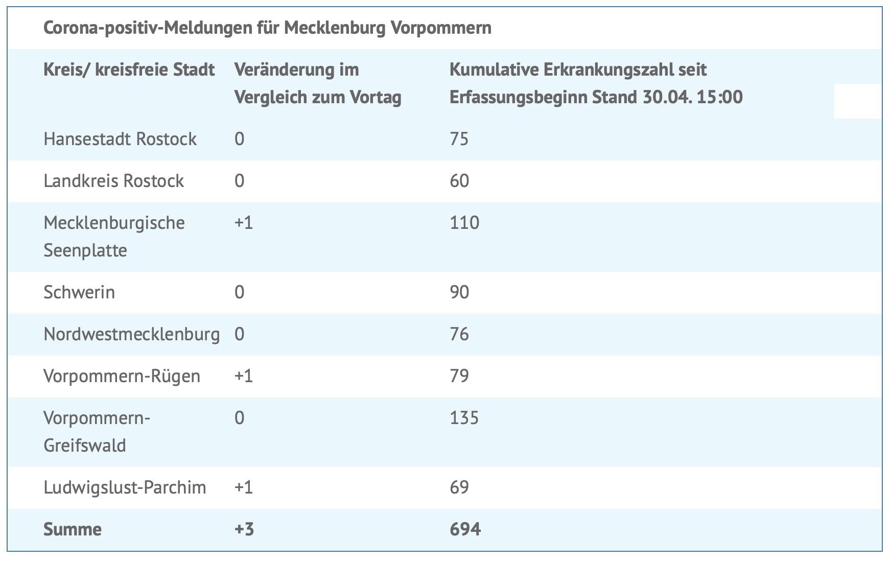 Seit gestern wurden drei neue Corona-Infektionen gemeldet. Insgesamt wurden bislang 694 Menschen in MV positiv auf das Virus getestet.