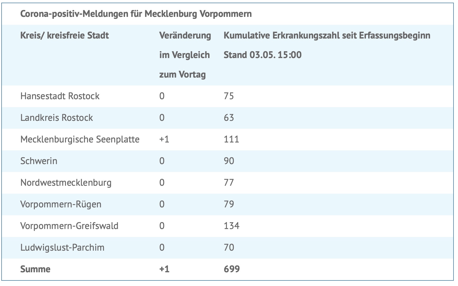Seit gestern wurde eine weitere Corona-Infektion gemeldet, und zwar im Landkreis Mecklenburgische Seenplatte. Insgesamt wurden bislang 699 Menschen in MV positiv auf das Virus getestet.