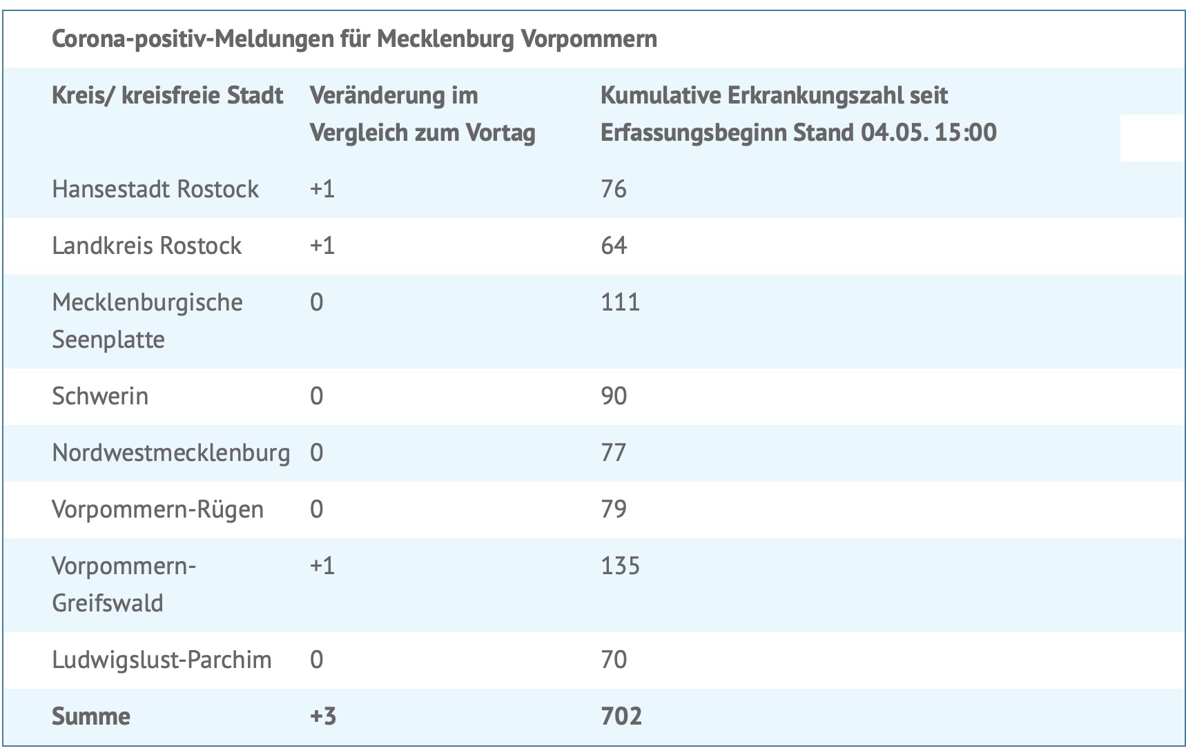 Seit gestern wurden drei weitere Corona-Infektionen gemeldet. Insgesamt wurden bislang 702 Menschen in MV positiv auf das Virus getestet.