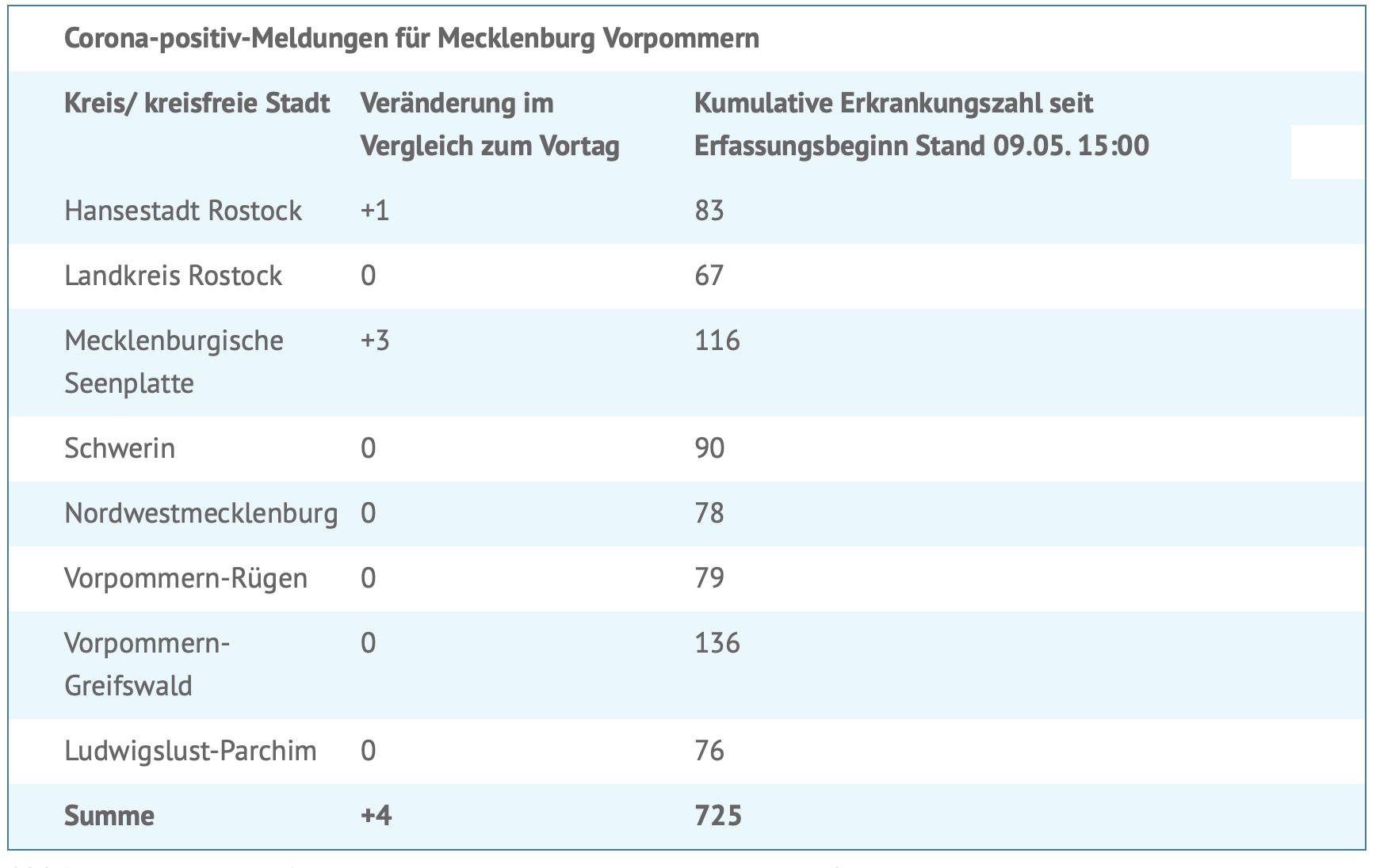 Seit gestern wurden vier weitere Corona-Infektionen gemeldet, drei davon im Landkreis Mecklenburgische Seenplatte. Insgesamt wurden bislang 725 Menschen in MV positiv auf das Virus getestet.