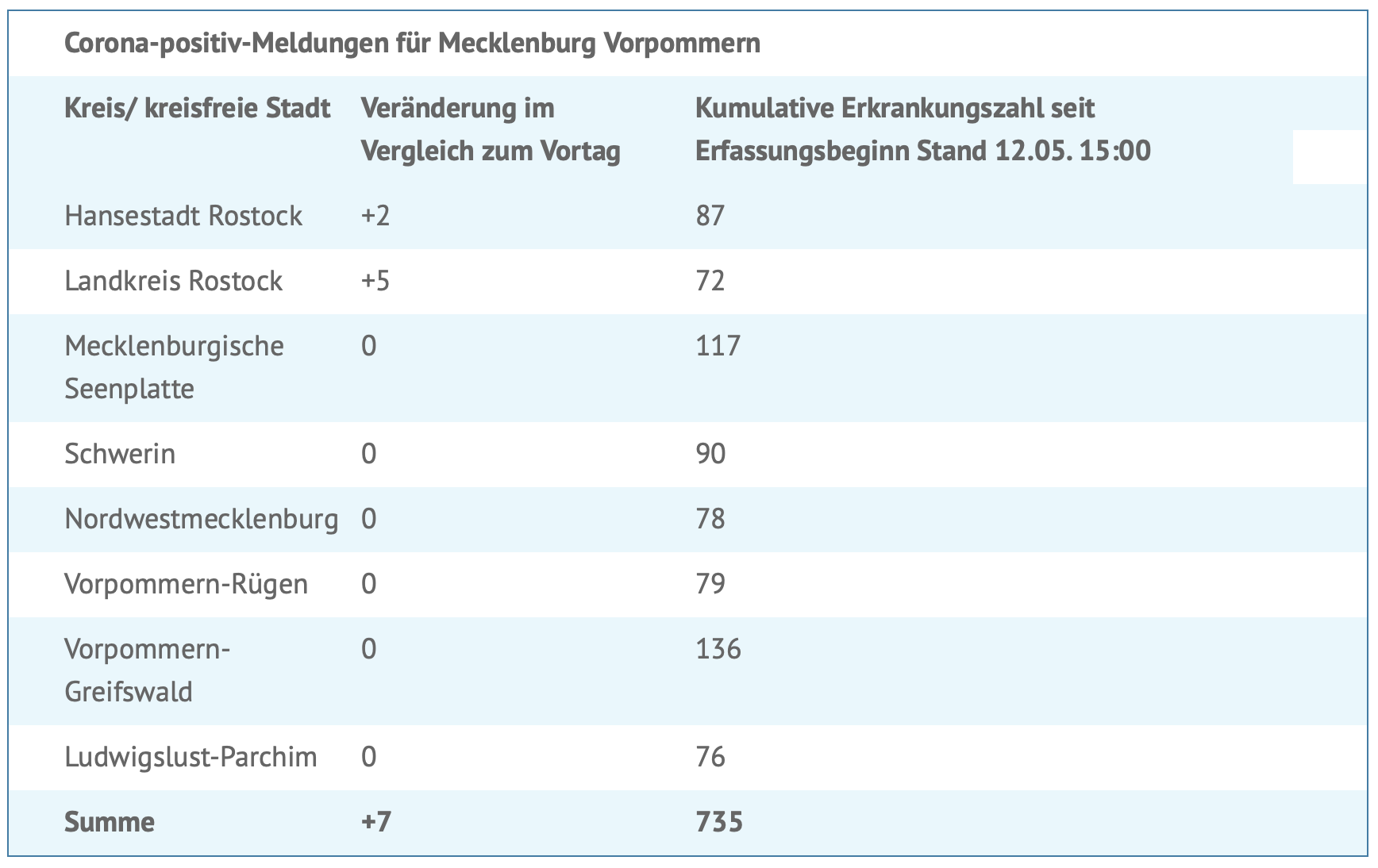 Seit gestern wurden sieben weitere Corona-Infektionen gemeldet. Insgesamt wurden bislang 735 Menschen in MV positiv auf das Virus getestet.