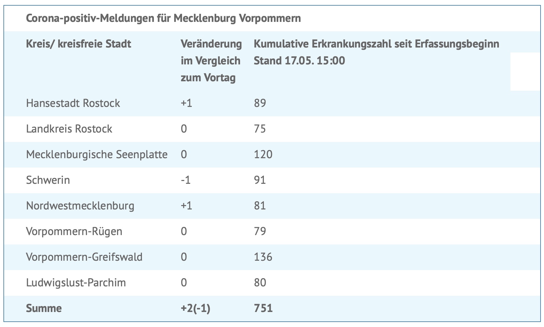 110 Personen mussten/müssen im Krankenhaus behandelt werden, 19 davon auf einer Intensivstation. Insgesamt gab es bislang 20 Sterbefälle in Mecklenburg-Vorpommern.