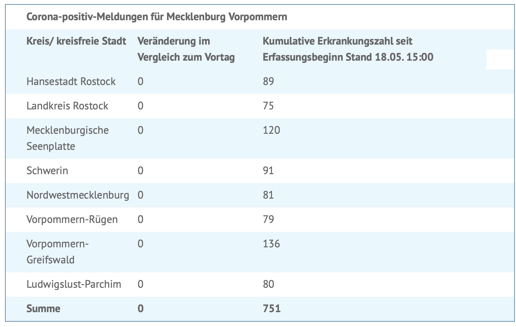 Wir veröffentlichen seit vielen Wochen jeden Tag die aktuellen Zahlen der Corona-Infizierten in Mecklenburg-Vorpommern. Erstmals seit dem 14. März wurden keine neuen Corona-Infektionen in unserem Land gemeldet.