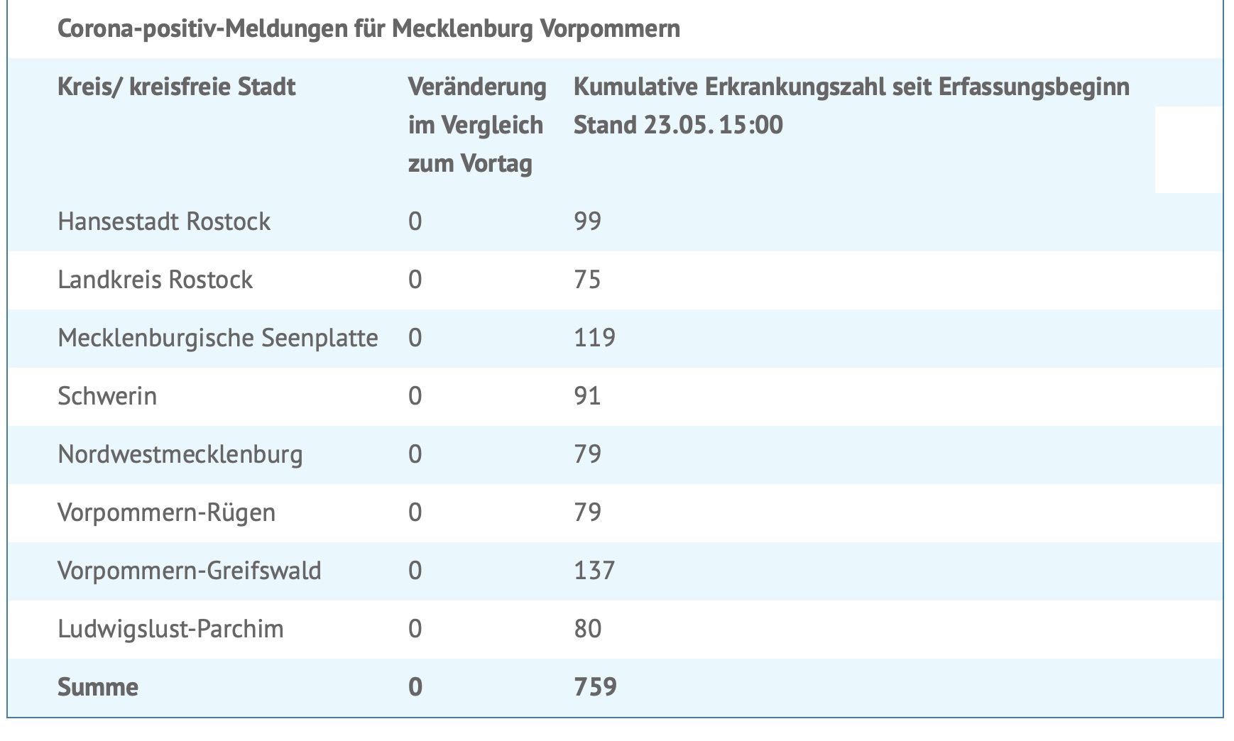 112 Personen mussten/müssen bislang insgesamt im Krankenhaus behandelt werden, 19 davon auf einer Intensivstation. Insgesamt gab es in Zusammenhang mit einer COVID-19-Infektion 20 Sterbefälle in Mecklenburg-Vorpommern.