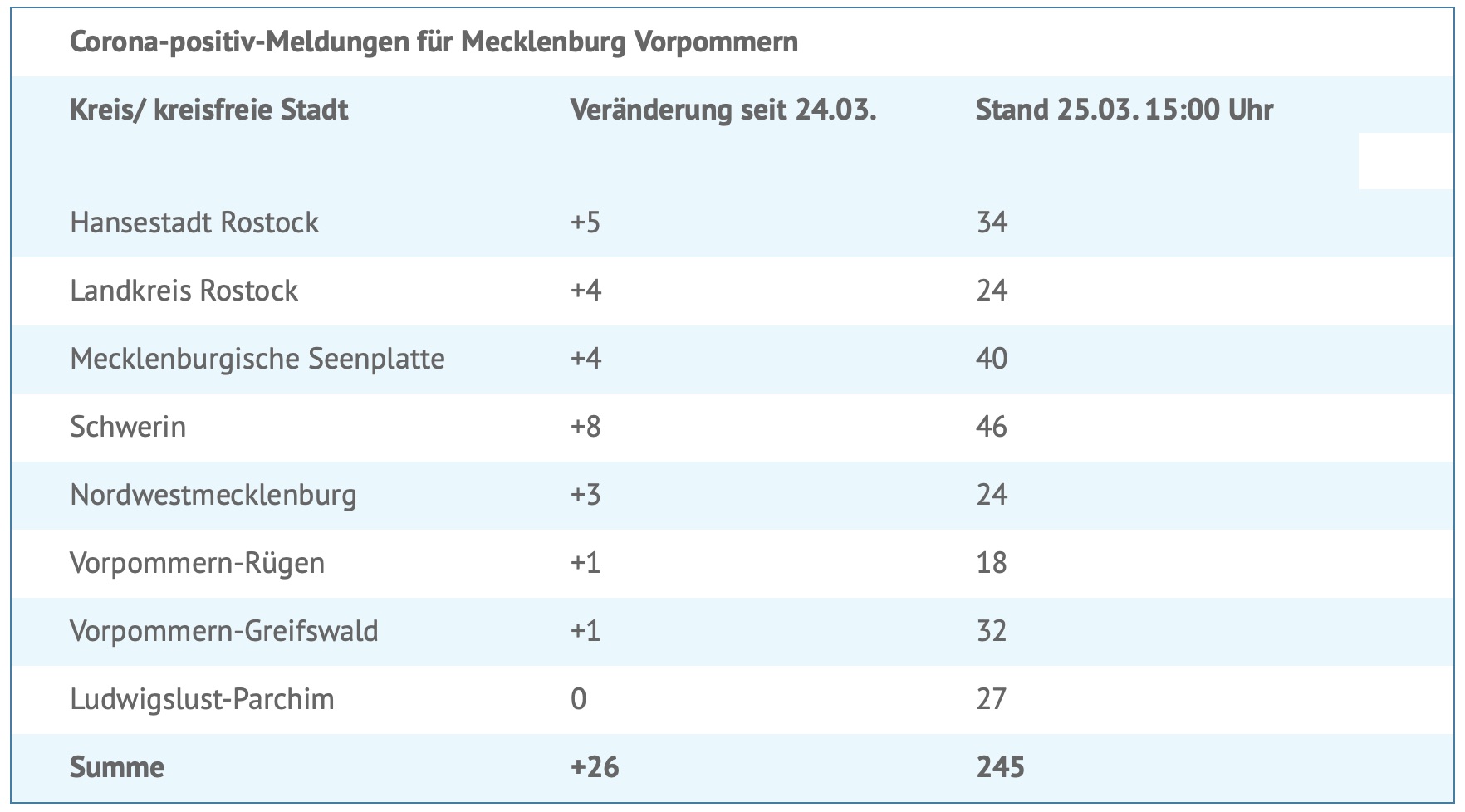 Seit gestern wurden 26 neue Corona-Infektionen aus den Landkreisen und kreisfreien Städten gemeldet, darunter 4 neue in unserem Landkreis. Insgesamt wurden bislang 245 Menschen in MV positiv auf das Virus getestet.