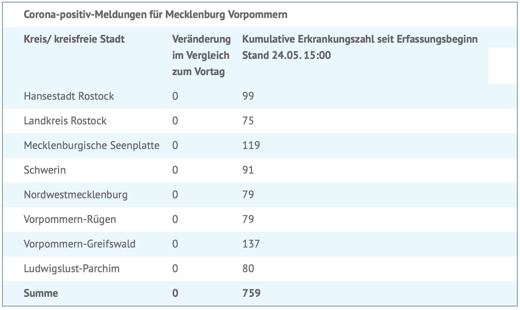112 Personen mussten/müssen bislang insgesamt im Krankenhaus behandelt werden, 19 davon auf einer Intensivstation. Insgesamt gab es in Zusammenhang mit einer COVID-19-Infektion 20 Sterbefälle in Mecklenburg-Vorpommern.