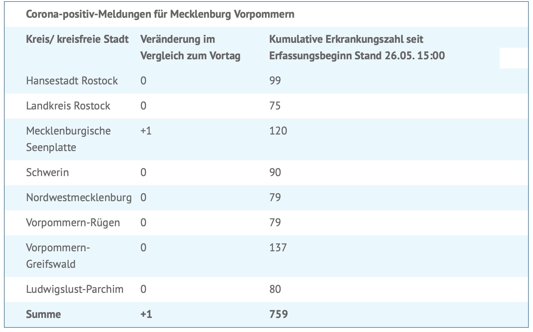 Seit gestern wurde eine weitere Corona-Infektion gemeldet, und zwar im Landkreis Mecklenburgische Seenplatte. Insgesamt wurden bislang 759 Menschen in MV positiv auf das Virus getestet.