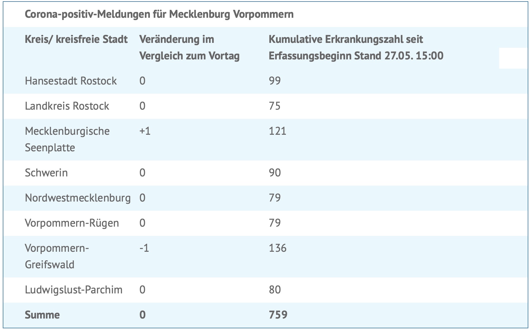 Ein aus dem Landkreis Vorpommern-Greifswald gemeldeter Fall wurde korrigiert und wird nun zum Landkreis Mecklenburgischer Seenplatte gezählt.