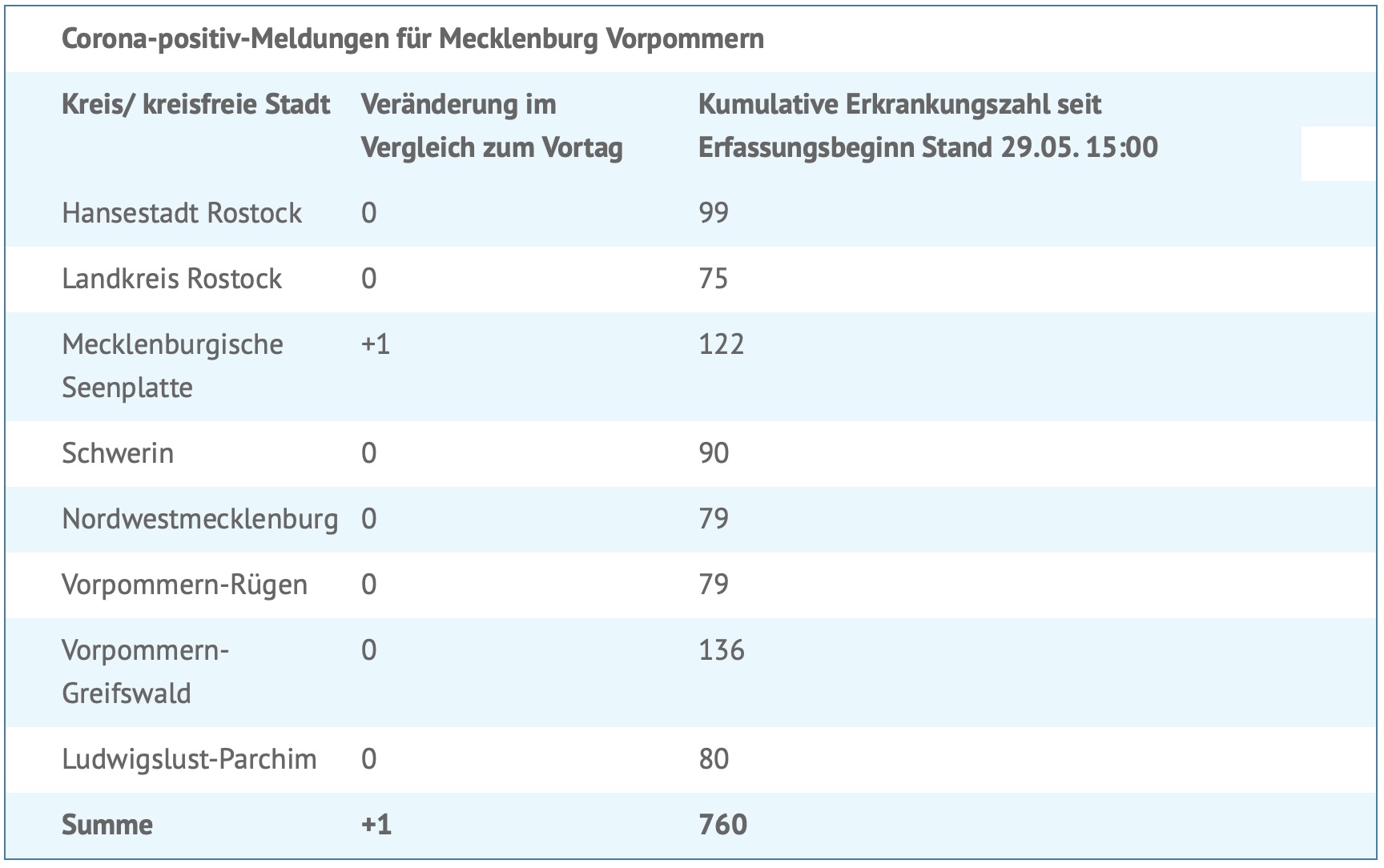 Seit gestern wurde in Mecklenburg-Vorpommern eine weitere Corona-Infektion gemeldet, und zwar imLandkreis Mecklenburgische Seenplatte. Insgesamt wurden bislang 760 Menschen in MV positiv auf das Virus getestet.