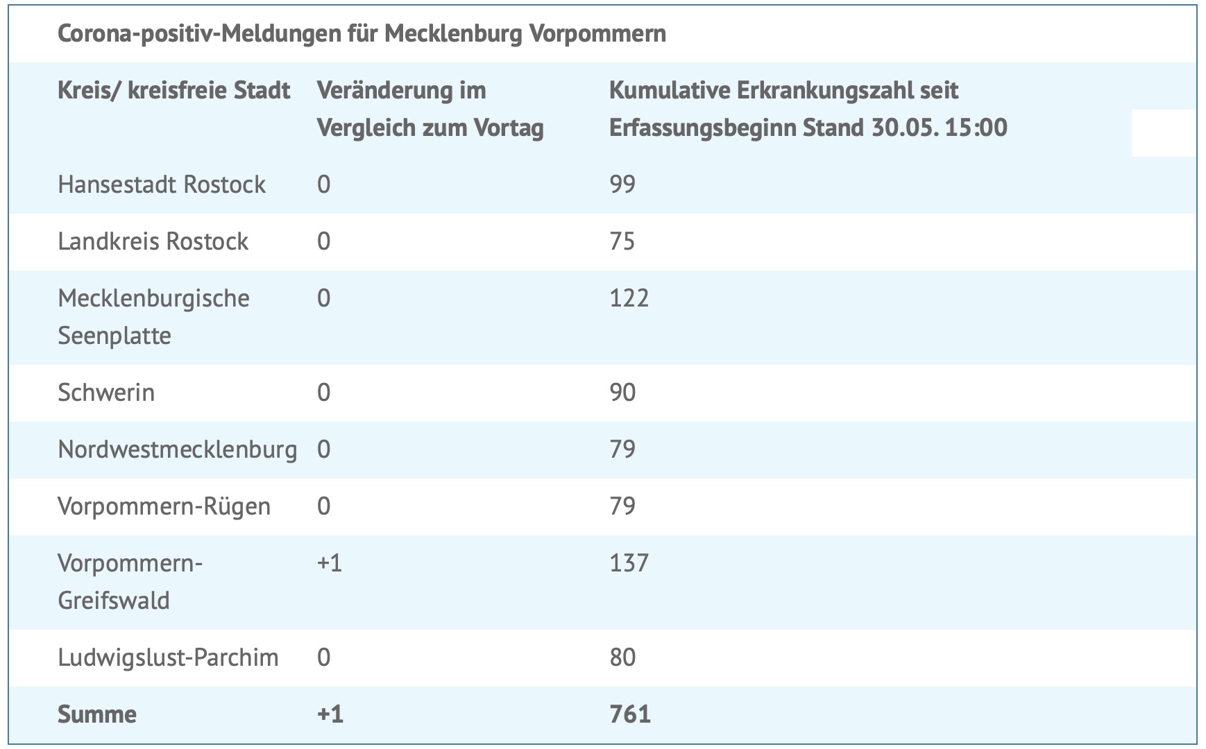 Seit gestern wurde eine weitere Corona-Infektion gemeldet. Insgesamt wurden bislang 761 Menschen in MV positiv auf das Virus getestet.