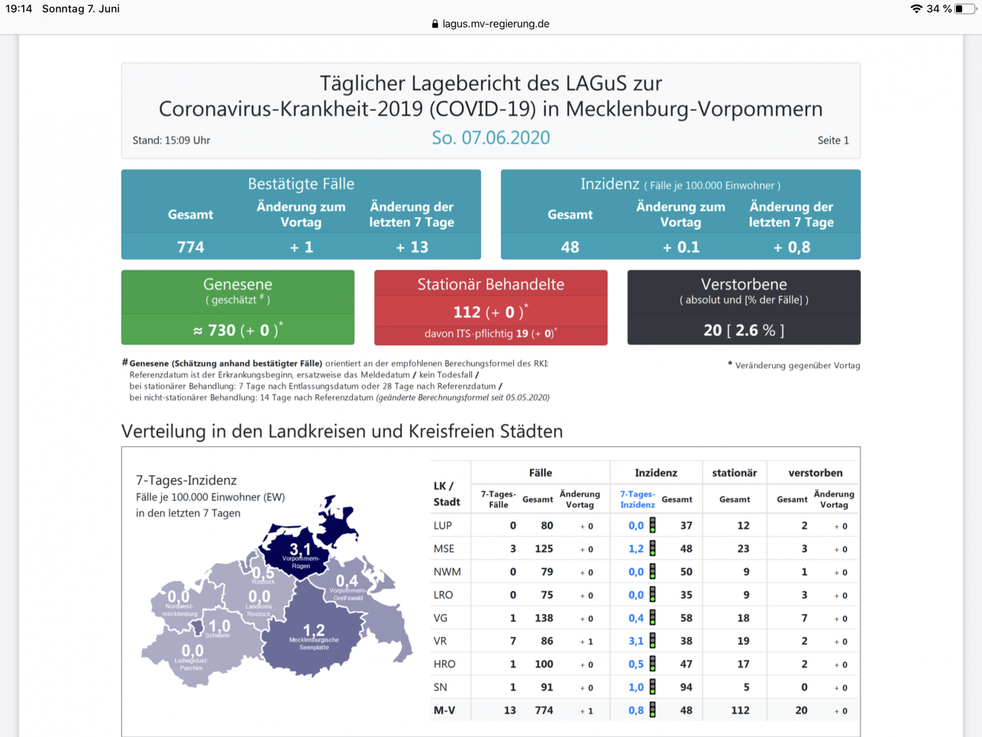 Landesweit müssen oder mussten 112 Menschen in Kliniken behandelt werden – 19 von ihnen auf Intensivstationen. Laut einer Schätzung des Robert Koch-Instituts (RKI) sind in Mecklenburg-Vorpommern 730 Personen der positiv getesteten Menschen von einer Covid-19-Erkrankung genesen. Insgesamt gab es bislang 20 Todesfälle im Nordosten.