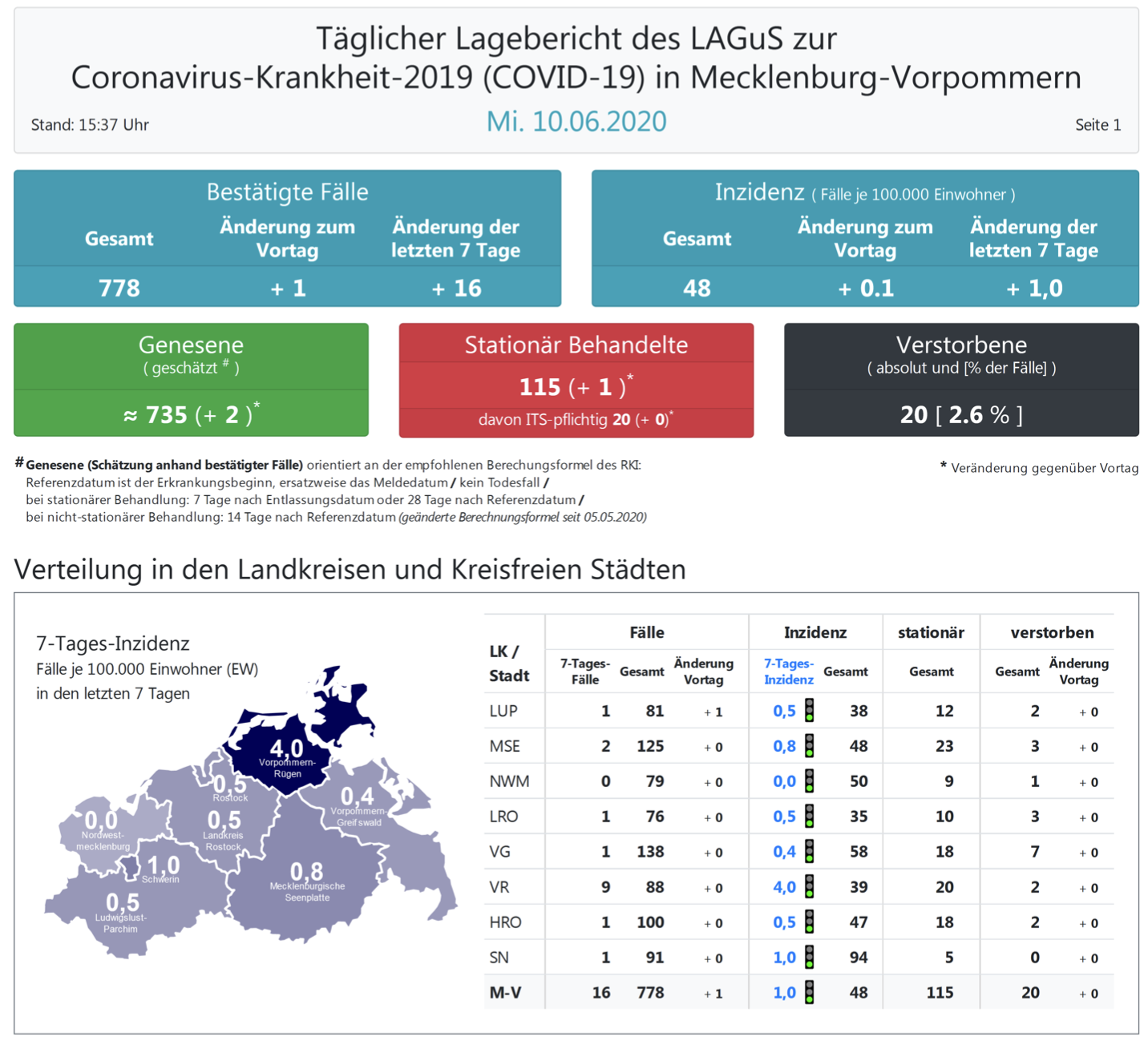 Landesweit müssen oder mussten 115 Menschen den Angaben zufolge in Kliniken behandelt werden – 20 von ihnen auf Intensivstationen. Laut einer Schätzung des Robert Koch-Instituts (RKI) sind in Mecklenburg-Vorpommern 735 Personen der positiv getesteten Menschen von einer Covid-19-Erkrankung genesen. Insgesamt gab es bislang 20 Todesfälle im Land.