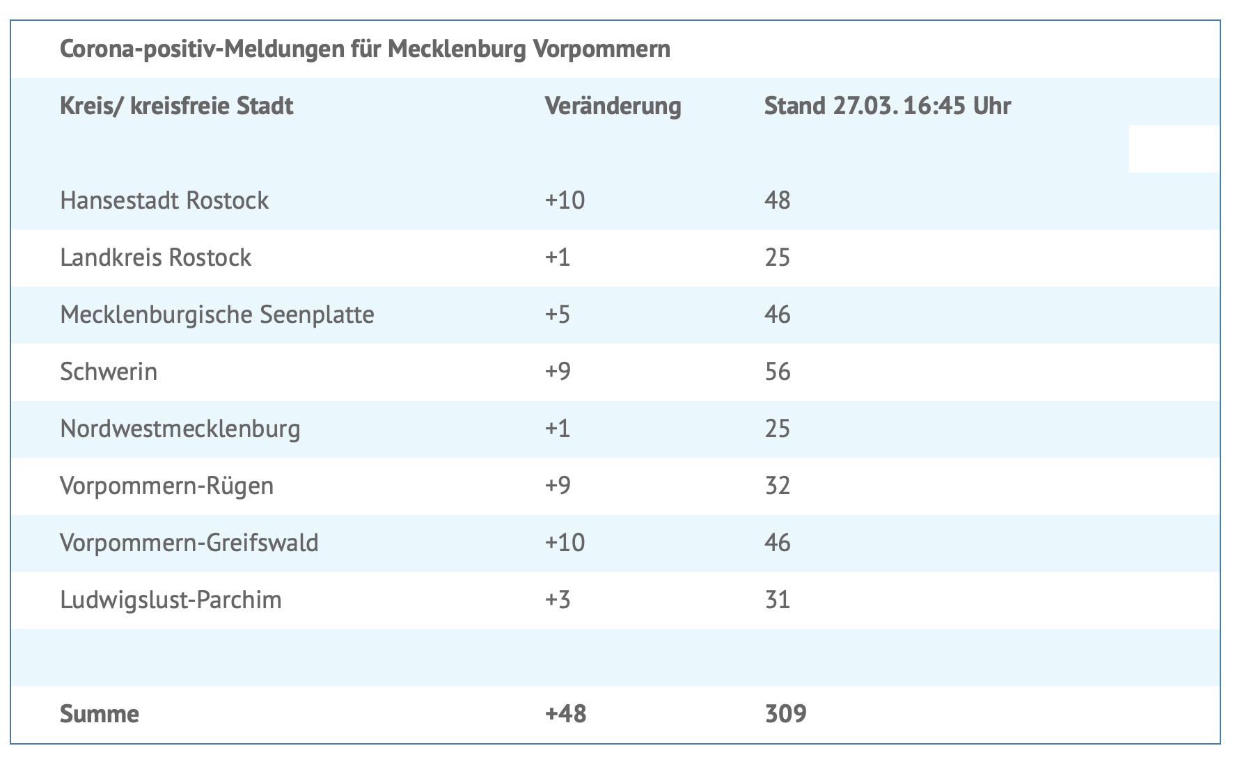Stärkerer Anstieg: Seit gestern wurden 48 neue Corona-Infektionen aus den Landkreisen und kreisfreien Städten gemeldet, davon fünf nneue im Landkreis Mecklenburgische Seenplatte. Insgesamt wurden bislang 309 Menschen in MV positiv auf das Virus getestet. 20 Personen mussten/müssen im Krankenhaus behandelt werden, vier davon auf einer Intensivstation.