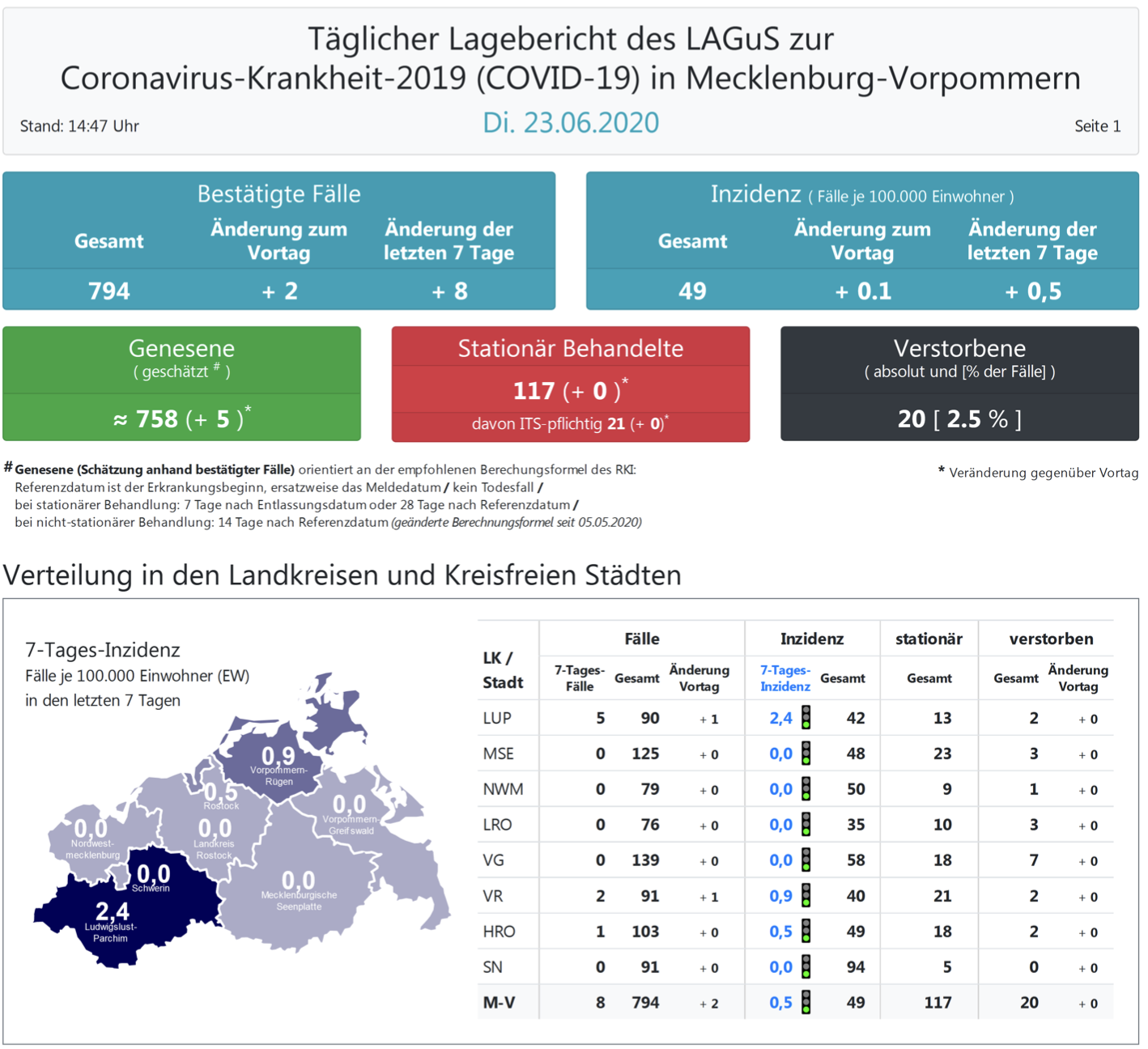 Landesweit müssen oder mussten 117 Menschen den Angaben zufolge in Kliniken behandelt werden – 21 von ihnen auf Intensivstationen. Laut einer Schätzung des Robert Koch-Instituts (RKI) sind in Mecklenburg-Vorpommern 758 Personen der positiv getesteten Menschen von einer Covid-19-Erkrankung genesen. Damit gelten 36 Personen in Mecklenburg-Vorpommern als derzeit infiziert. Insgesamt gab es bislang 20 Todesfälle im Nordosten.