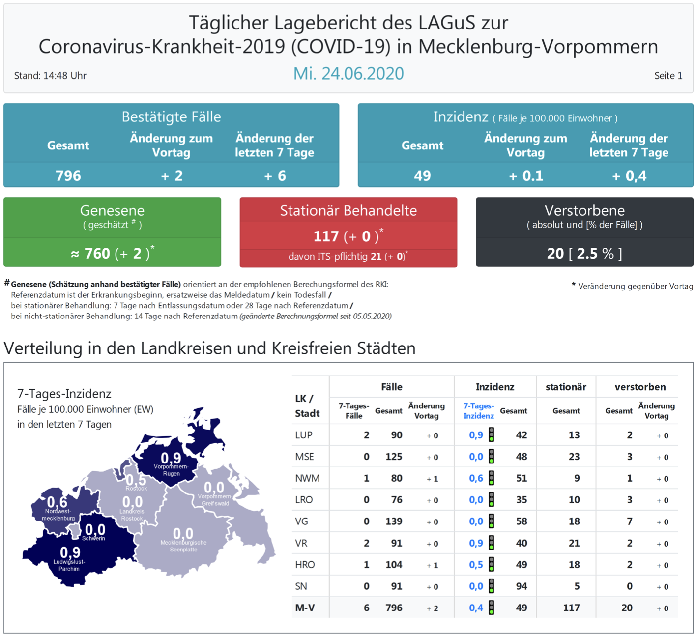 Landesweit müssen oder mussten 117 Menschen den Angaben zufolge in Kliniken behandelt werden – 21 von ihnen auf Intensivstationen. Laut einer Schätzung des Robert Koch-Instituts (RKI) sind in Mecklenburg-Vorpommern 760 Personen der positiv getesteten Menschen von einer Covid-19-Erkrankung genesen. Damit gelten 36 Personen in Mecklenburg-Vorpommern als derzeit infiziert. Insgesamt gab es bislang 20 Todesfälle im Land.