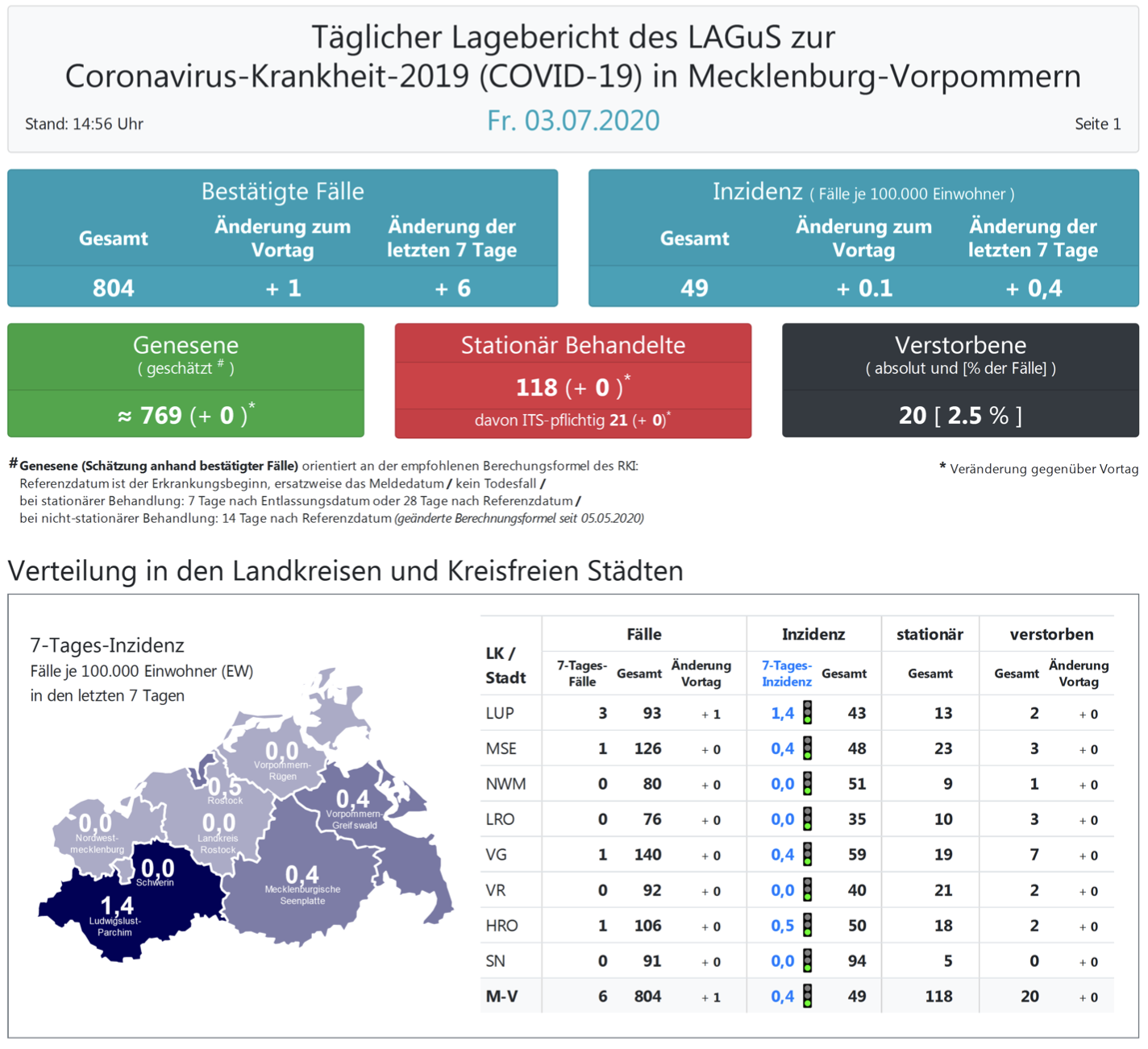 Landesweit müssen oder mussten 118 Menschen den Angaben zufolge in Kliniken behandelt werden – 21 von ihnen auf Intensivstationen. Laut einer Schätzung des Robert Koch-Instituts (RKI) sind in Mecklenburg-Vorpommern 769 Personen der positiv getesteten Menschen von einer Covid-19-Erkrankung genesen. Insgesamt gab es bislang 20 Todesfälle in MV.