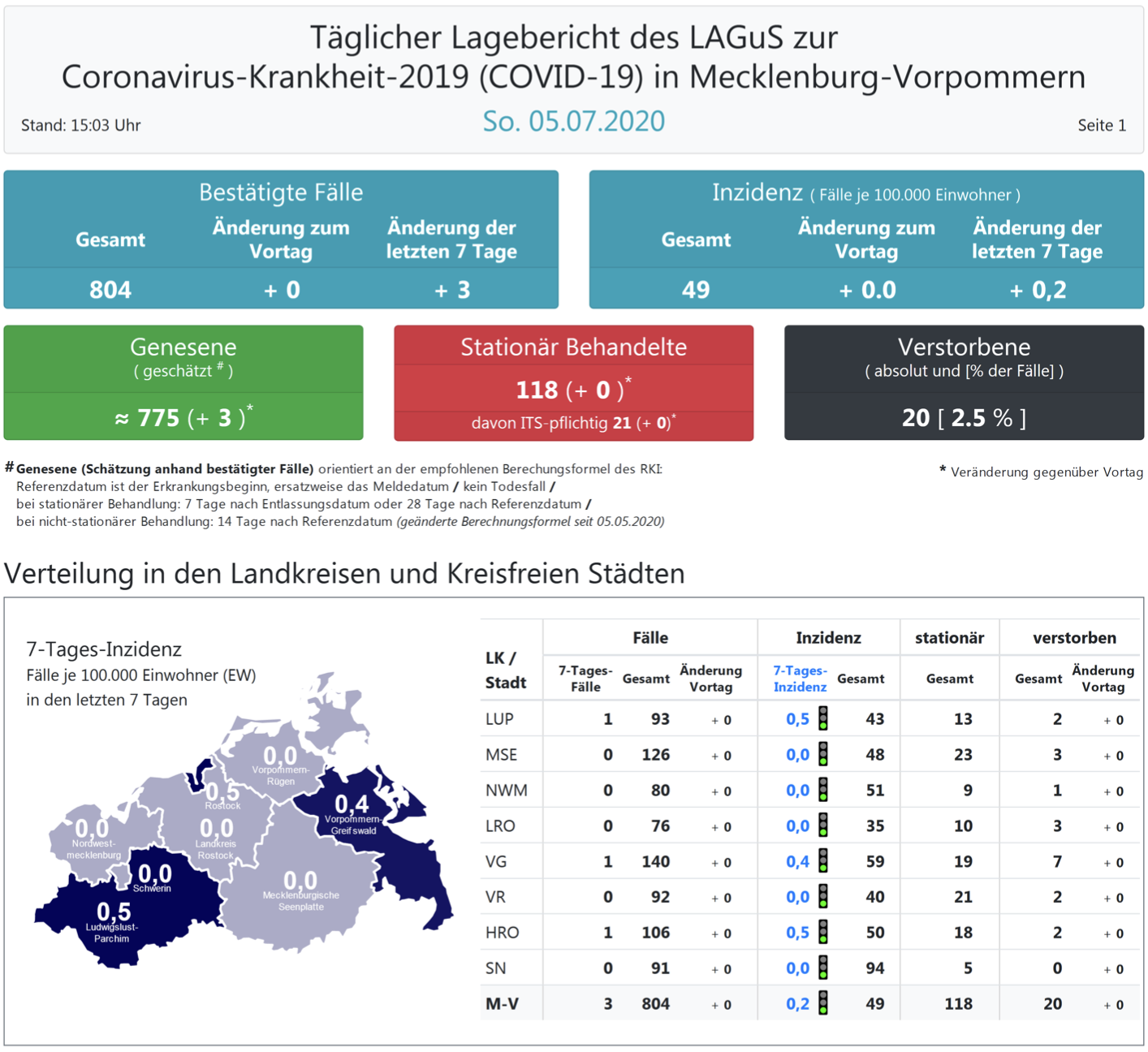 Landesweit müssen oder mussten 118 Menschen den Angaben zufolge in Kliniken behandelt werden – 21 von ihnen auf Intensivstationen. Laut einer Schätzung des Robert Koch-Instituts (RKI) sind in Mecklenburg-Vorpommern 775 (+3) Personen der positiv getesteten Menschen von einer Covid-19-Erkrankung genesen. Insgesamt gab es bislang 20 Todesfälle im Land.