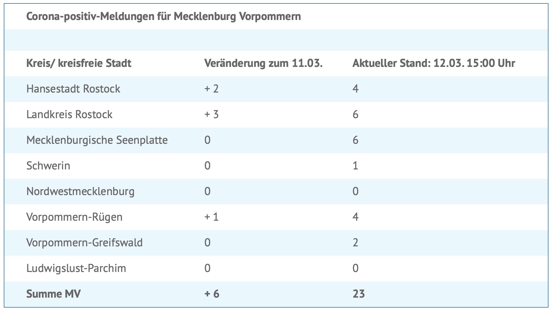 Am 12. März haben die Gesundheitsbehörden in Mecklenburg-Vorpommern sechs neue Corona-Infektionen an das Robert Koch-Institut gemeldet (siehe Tabelle).