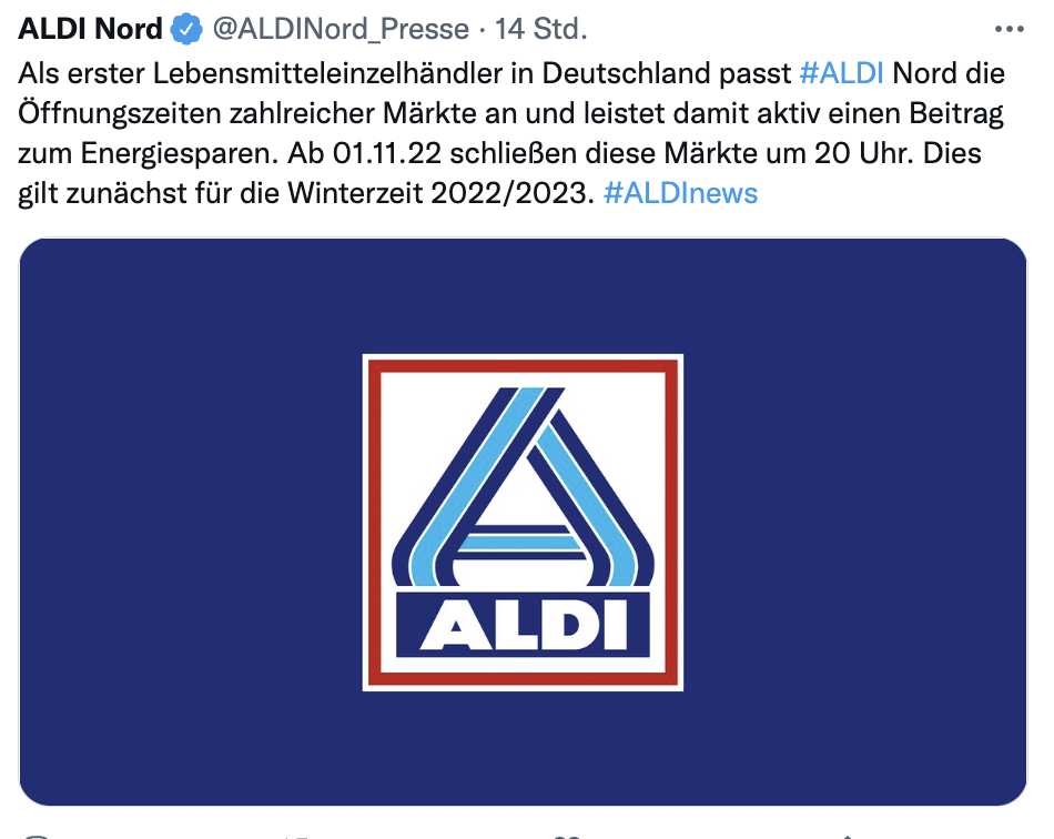 ALDI Nord will seine Filialen ab November früher schließen und damit einen Beitrag zum Energiesparen leisten. Das gab das Unternehmen auf Twitter bekannt.
