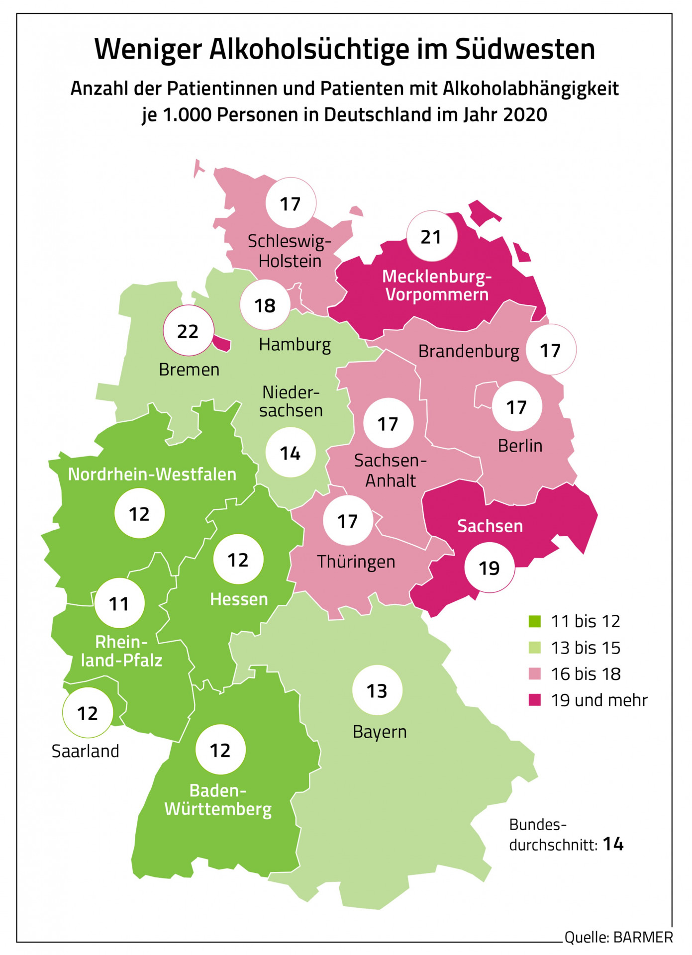 In Mecklenburg-Vorpommern und Bremen gibt es über 50 Prozent mehr alkoholkranke Menschen als im Bundesschnitt. Das geht aus einer Auswertung des BARMER Instituts für Gesundheitssystemforschung (bifg) hervor. Demnach diagnostizierten Ärzte im vergangenen Jahr in Mecklenburg-Vorpommern bei 21 und in Bremen sogar bei 22 je 1.000 Personen eine Alkoholabhängigkeit. Der Bundesschnitt lag bei 14 je 1.000. Die geringsten Prävalenzen gab es in Rheinland-Pfalz mit 11 je 1.000 Personen. „Die massiven regionalen Unterschiede bei der Alkoholabhängigkeit sind rein medizinisch nicht erklärbar. Hier dürften auch sozio-demographische Faktoren eine Rolle spielen“, sagt Dr. Ursula Marschall, Leitende Medizinerin bei der BARMER.