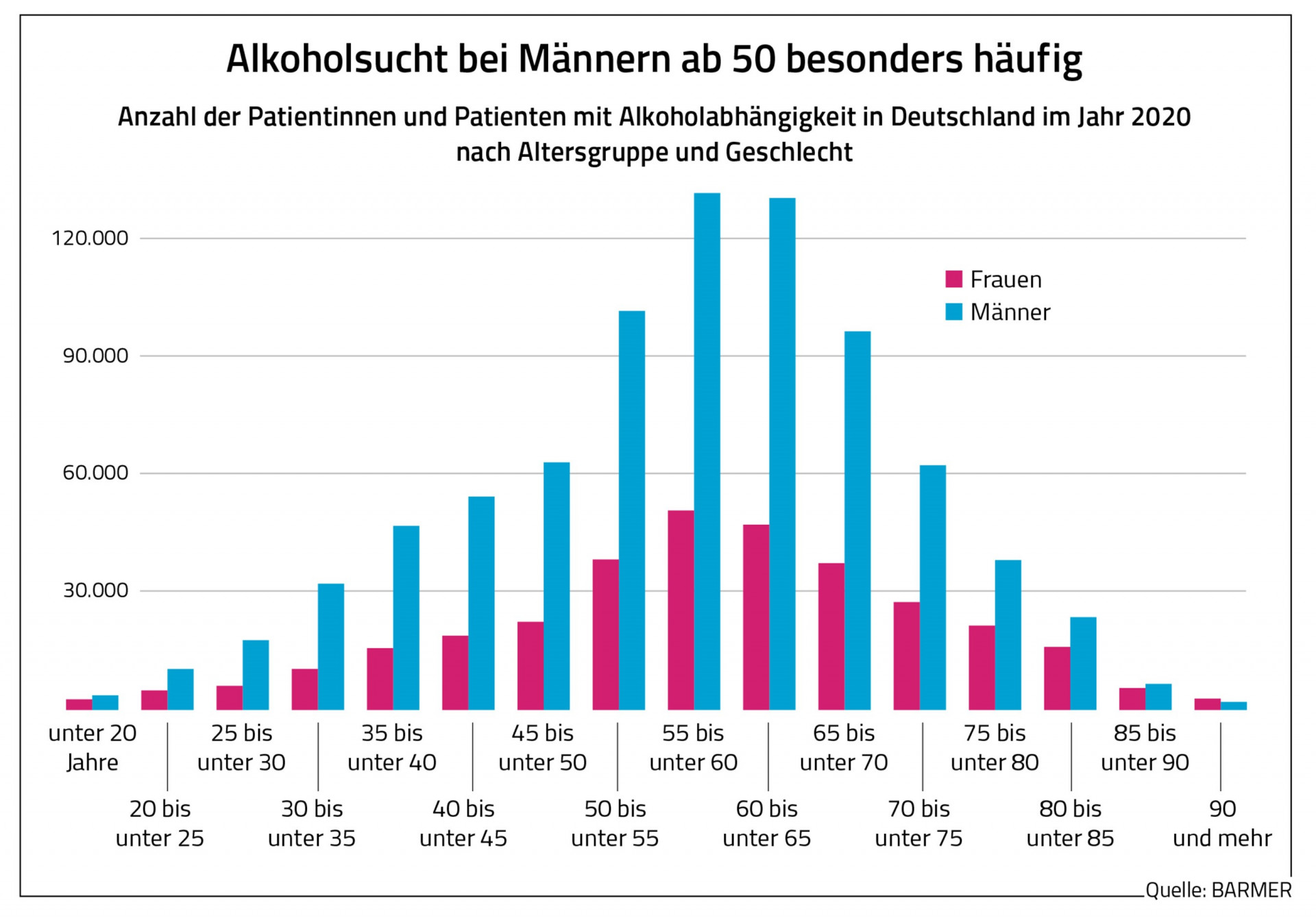 Wie aus der BARMER-Auswertung weiter hervorgeht, waren im vergangenen Jahr in Deutschland 820.000 Männer und 329.000 Frauen erwiesenermaßen alkoholabhängig. Dabei sind vor allem Menschen in der zweiten Lebenshälfte betroffen gewesen. So waren unter den 55- bis 60-jährigen Männern zuletzt rund 131.000 alkoholabhängig und knapp 51.000 Frauen in derselben Altersgruppe.