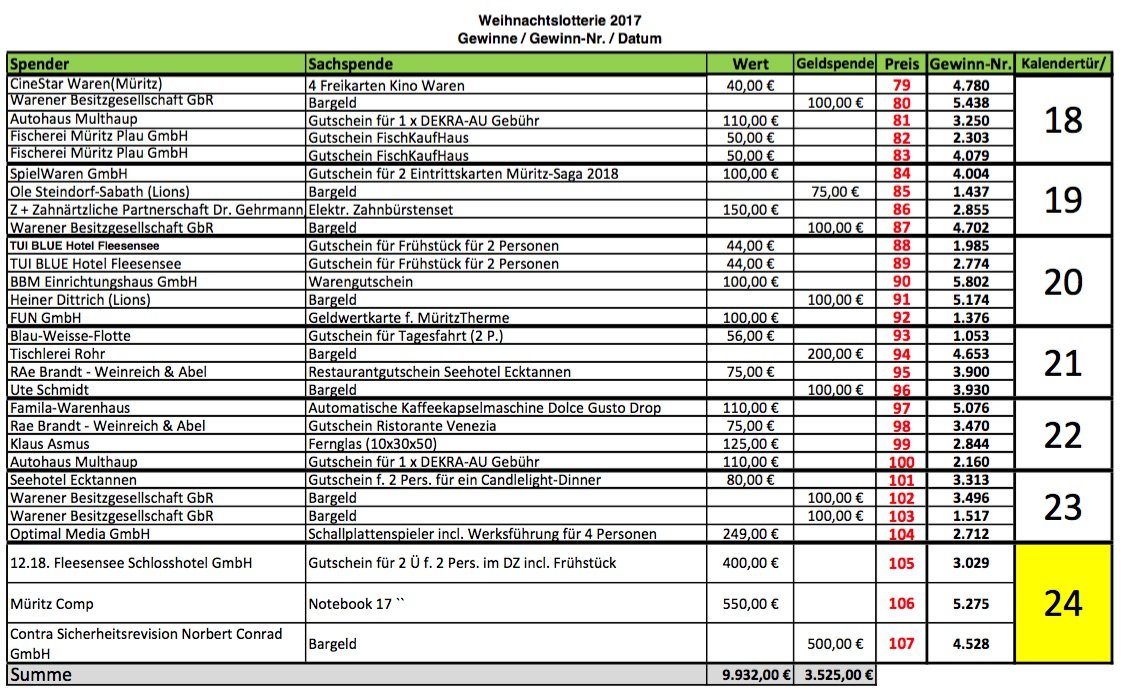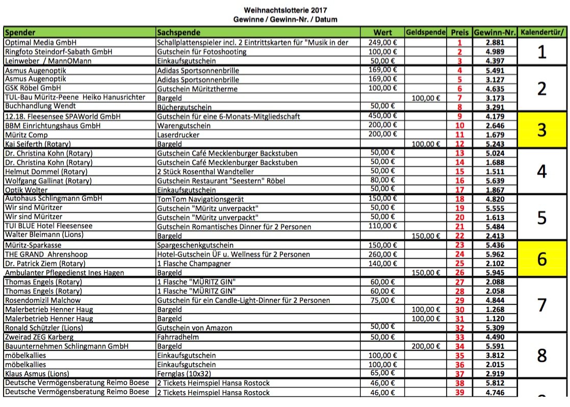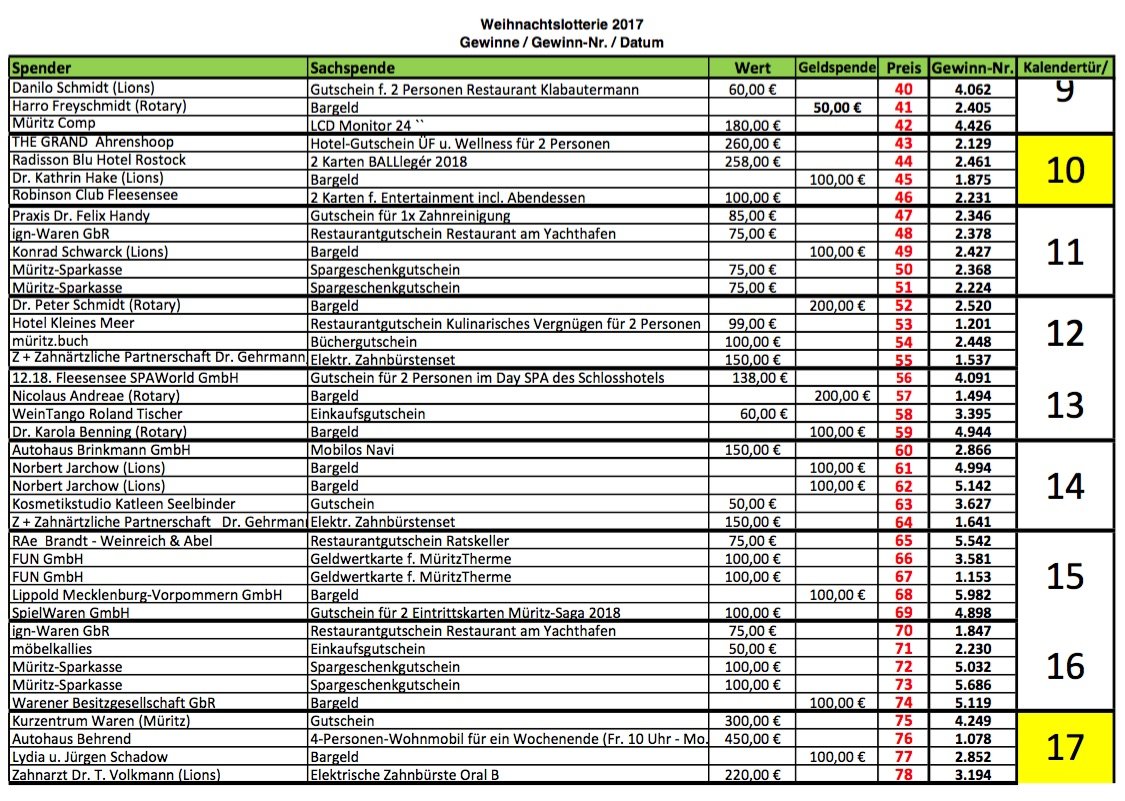 Heute auf vielfachen Leser-Wunsch noch einmal alle Gewinnzahlen der Weihnachtslotterie des Lionsclub Müritz sowie des Rotaryclub Waren in einer Übersicht. Und der Hinweis: Die Sachpreise können bei Möbel Kallies in der Strelitzer Straße abgeholt werden, die Geldpreise bei Kücker Finanz am Alten Markt in Waren.