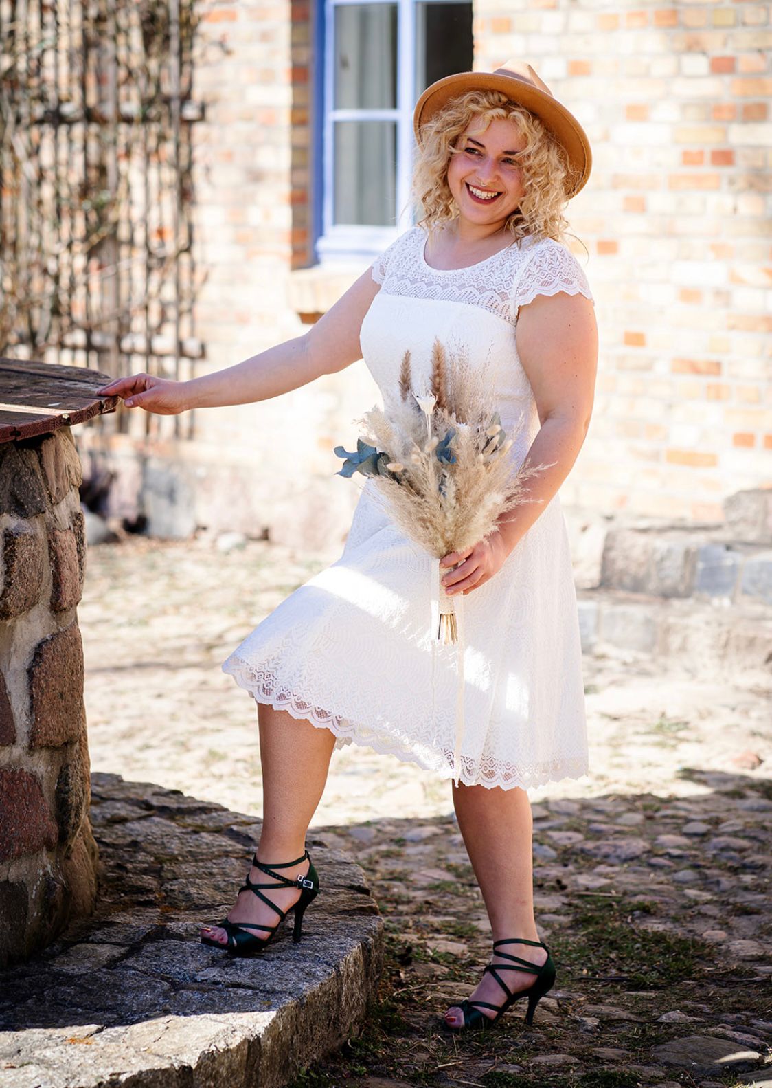 Eigentlich hat Maria einen anderen Beruf, Brautmoden sind “nur” ihr Hobby. Und das lebt sie im Gutshaus Alt Schönau aus. Zwischen alten, großen Bäumen und inmitten eines urigen Park liegt ihr kleines Geschäft. Wer zu ihr kommt, wird herzlich empfangen – von Maria, die zumeist einen Blumenkranz im Haar trägt. Der passt zu ihr und ihrer fröhlichen Art.