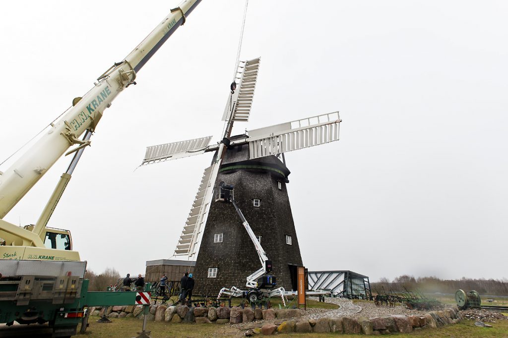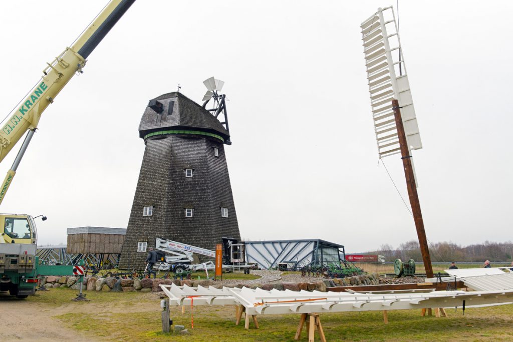 Mit ihrer Spannweite von 22 Metern auf einem 3,60 Meter großen Kammrad grüßt die alte Mühle die Gäste des AGRONEUM jetzt wieder von der Autobahn 19 aus. „Es war sehr beeindruckend, zu sehen, wie die Flügel montiert wurden. Das erlebt man nicht alle Tage“, erzählte Hans-Dieter Graf, der das Ereignis für „Wir sind Müritzer“ auch im Bild festgehalten hat.