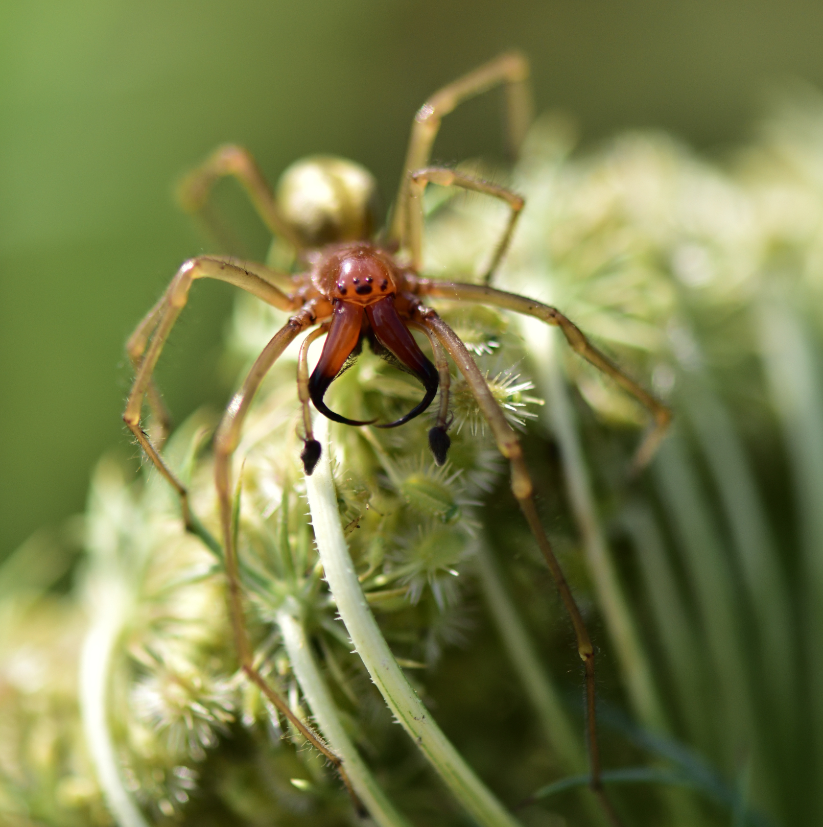 Eigentlich ist die Spinne sehr friedlich. Nur bei Störungen am Nest oder wenn sie sich bedroht fühlt, lässt sie uns ihre Mandibeln spüren. Ich habe sie von einer Dolde gestreift und erst danach bemerkt, wer sich da gestört fühlte.