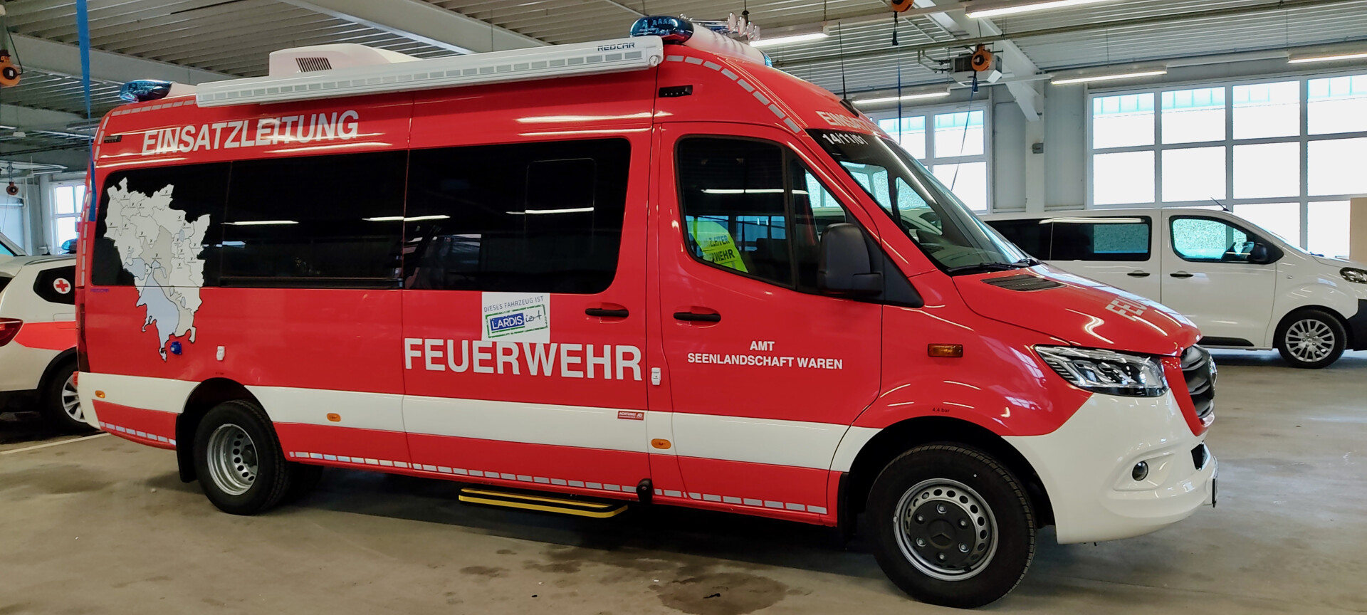 Der neue Einsatzleitwagen 1 (ELW 1) wurde auf Basis eines Mercedes Benz Sprinter 519 CDI aufgebaut. Das Basisfahrzeug lieferte das Autohaus „Auto Brinkmann“ aus Waren. Aufgebaut wurde der Einsatzleitwagen von der Firma REDCAR GmbH in Adendorf. Das optische „I“ Tüpfelchen der Beklebung – gezeigt wird das Amtsgebiet – übernahm das „Müritzer Werbestudio“ und den Einbau der Funk- und Kommunikationstechnik die Firma „FunkKomm Müritz“.