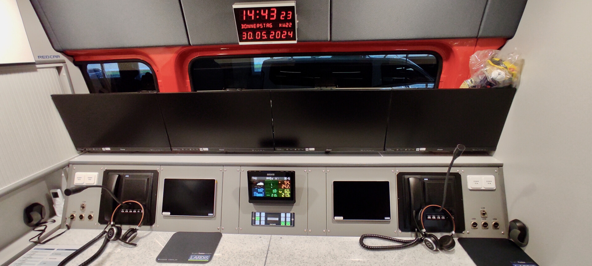 Auf den mitgeführten Whiteboards kann die Einsatzlage grafisch dargestellt werden. An zwei Arbeitsplätzen mit fest eingebauten CAR-PC’s mit insgesamt fünf Monitoren können topografische Karten, Rettungskarten oder Live-Bilder einer Drohne angezeigt werden. Online können zeitgleich mit dem integriertem WLAN-Modul Recherchen über zum Beispiel Gefahrstoffe vorgenommen werden. Ein Farbdrucker sorgt für die Visualisierung und den Faxempfang.