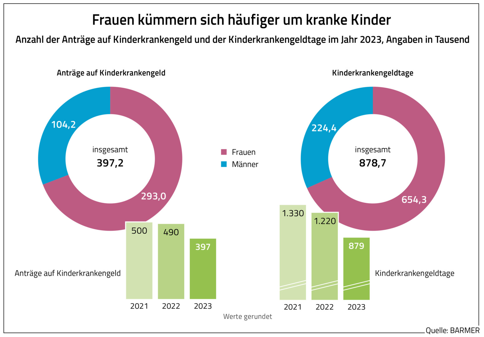 Frauen aus Mecklenburg-Vorpommern beantragen nach wie vor deutlich öfter als Männer Kinderkrankengeld. Das belegt eine aktuelle Analyse von entsprechenden Daten der Barmer. So wurden vom 1. Januar bis zum 31. Dezember 2023 landesweit rund 23.000 Anträge von Frauen und rund 9.160 Anträge von Männern gestellt, die bei der Krankenkasse versichert waren. Bundesweit sind im selben Zeitraum 292.962 Anträge von Frauen und 104.259 Anträge von Männern eingegangen. „Das Kinderkrankengeld ist ein wichtiges Instrument, um Belastungen von Eltern zu mindern und eine gesunde Umgebung für Familien zu schaffen. Allerdings zeigt unsere Untersuchung auch, dass Frauen nach wie vor die Hauptlast bei der Kinderbetreuung tragen. Sie bleiben häufiger zuhause, um bei Krankheit des Kindes die Betreuung sicherzustellen“, sagt Henning Kutzbach, Landesgeschäftsführer der Barmer in Mecklenburg-Vorpommern.