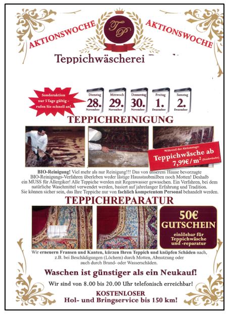 Die angebotenen Preise sind in der Regel alles andere als ein Schnäppchen, sondern deutlich überteuert. Oftmals werden die vereinbarten Leistungen gar nicht ausgeführt und der Kunde erhält den Teppich unbehandelt bzw. in manchen Fällen auch gar nicht zurück.
