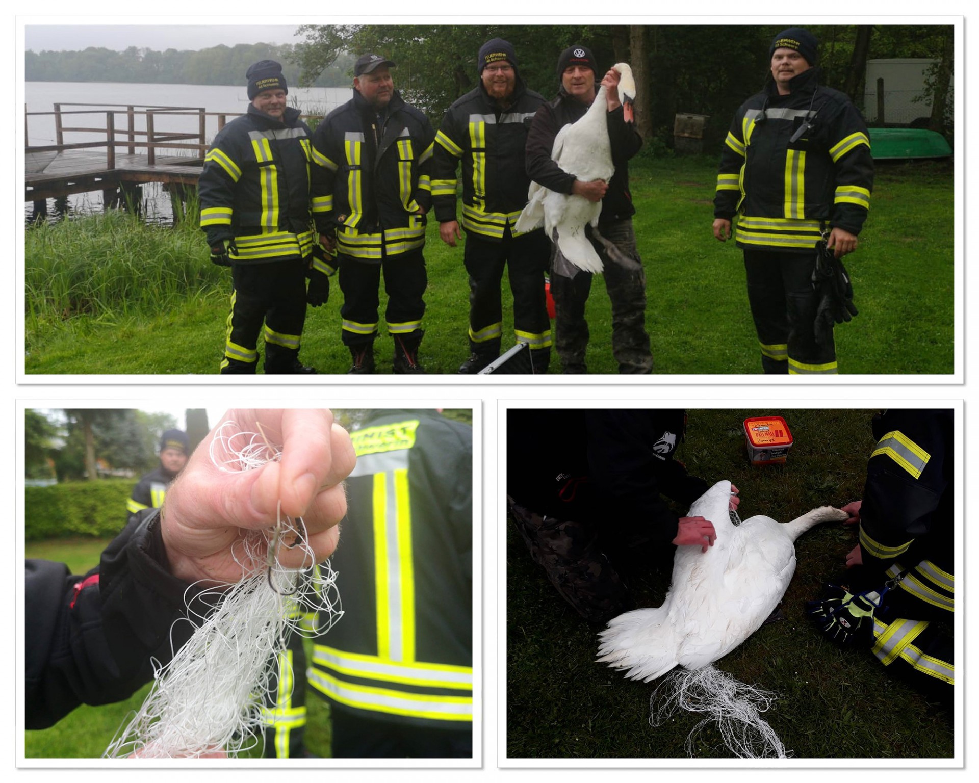 „Wir mussten den Schwan mit mehreren Kameraden festhalten. Der Angelhaken hatte sich bereits tief in den Hals des Tieres gebohrt“, sagte uns Rene Stumpp, Wehrführer der Freiwilligen Feuerwehr Alt Schwerin. Kurze Zeit später war der aufgeregte Schwan wieder befreit. Die Wunde am Hals wurde noch versorgt, ehe der Schwan wieder ins Wasser gesetzt werden konnte. „Angler sollten unbedingt aufpassen, keine Haken und Angelsehne zurückzulassen. Der Schwan wäre ohne Hilfe in wenigen Tagen vermutlich gestorben“, so Stumpp. Dem Schwan gehts übrigens wieder prächtig.