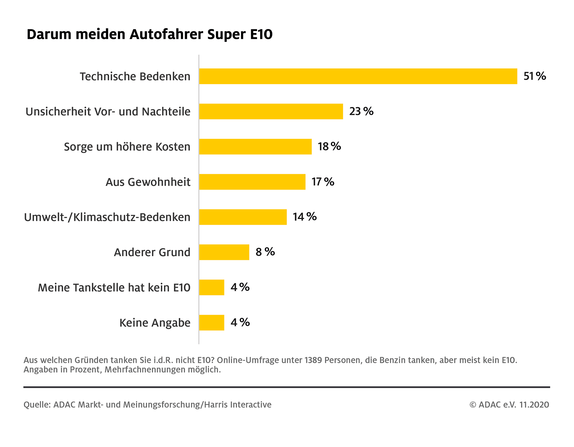 Gut die Hälfte der Befragten, die E10 nicht tanken, hat laut ADAC Umfrage nach wie vor Bedenken, ob ihr Auto Super E10 aus technischer Sicht verträgt. Die Unsicherheit darüber, ob das eigene Fahrzeug E10 verträgt ist groß, teilweise fehlen korrekte Informationen über die Verträglichkeit. Weitere Gründe, warum Autofahrer E10 meiden, sind mangelhafte Kenntnisse über die Vor- und Nachteile dieser Benzin-Sorte. Verbreitet ist auch die Sorge, dass der Kraftstoffverbrauch und damit die Kosten durch Super E10 steigen könnten. Ein weiterer Teil der Befragten hat Bedenken bezüglich des Umwelt- und Klimaschutzes.