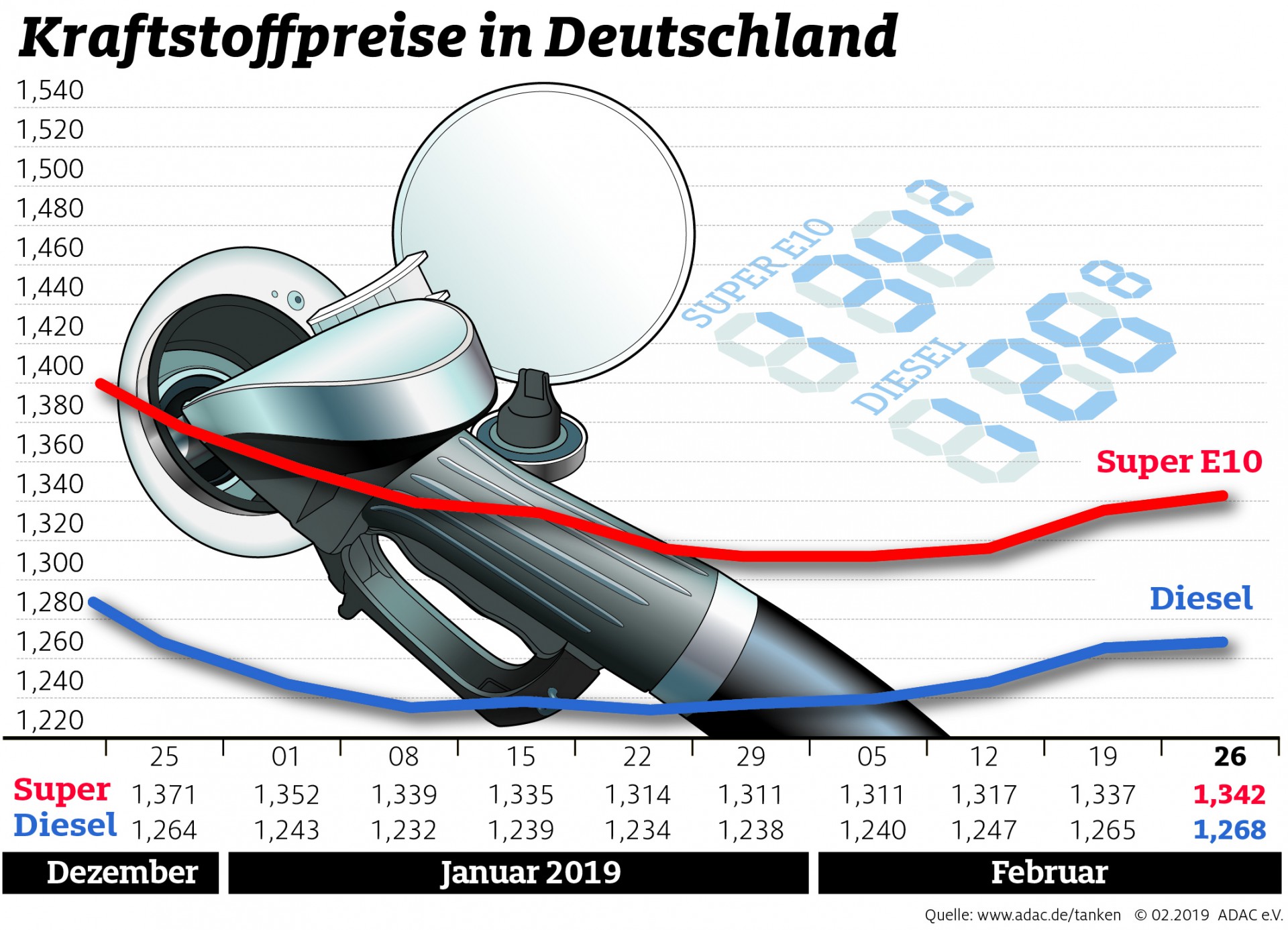 Tanken wird wieder teurer. Laut aktueller Auswertung des ADAC kostet ein Liter Super E10 im Bundesdurchschnitt 1,342 Euro, das sind 0,5 Cent mehr als in der Vorwoche. Für Diesel müssen Autofahrer im Mittel 1,268 Euro bezahlen, ein Anstieg von 0,3 Cent.