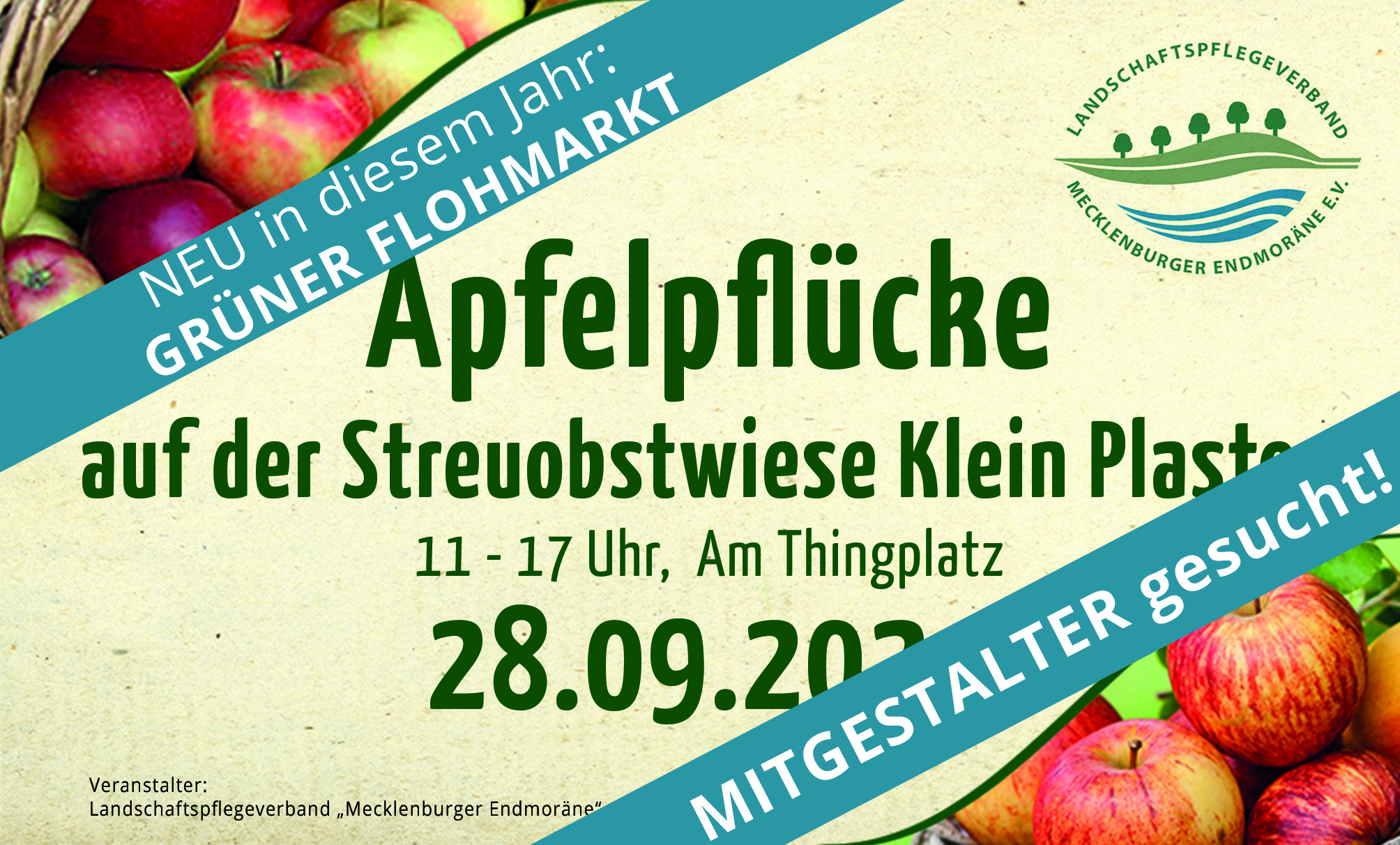 Auch in diesem Jahr lädt der Landschaftspflegeverband „Mecklenburger Endmoräne“ am 28. September von 11-17 Uhr wieder zur „Apfelpflücke“ auf die Streuobstwiesen nach Klein Plasten ein und sucht noch Mitgestalter. „Wir möchten gerne lokale und regionale Menschen, Vereine und Anbieter zum aktiven Mitmachen bei der Angebotsgestaltung einladen“, so Matthias Bormann, Geschäftsführer des Verbandes. Geplant ist, zum ersten Mal einen Grünen Flohmarkt zu veranstalten.