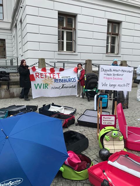 Heute haben Reisebüro-Mitarbeiter aus ganz Deutschland bei mehreren Demonstrationen ein Zeichen gesetzt und auf ihre Lage in der Corona-Krise aufmerksam gemacht. Ihre Forderung an die Politik: finanzielle Soforthilfen, um die Corona-Krise zu überstehen.