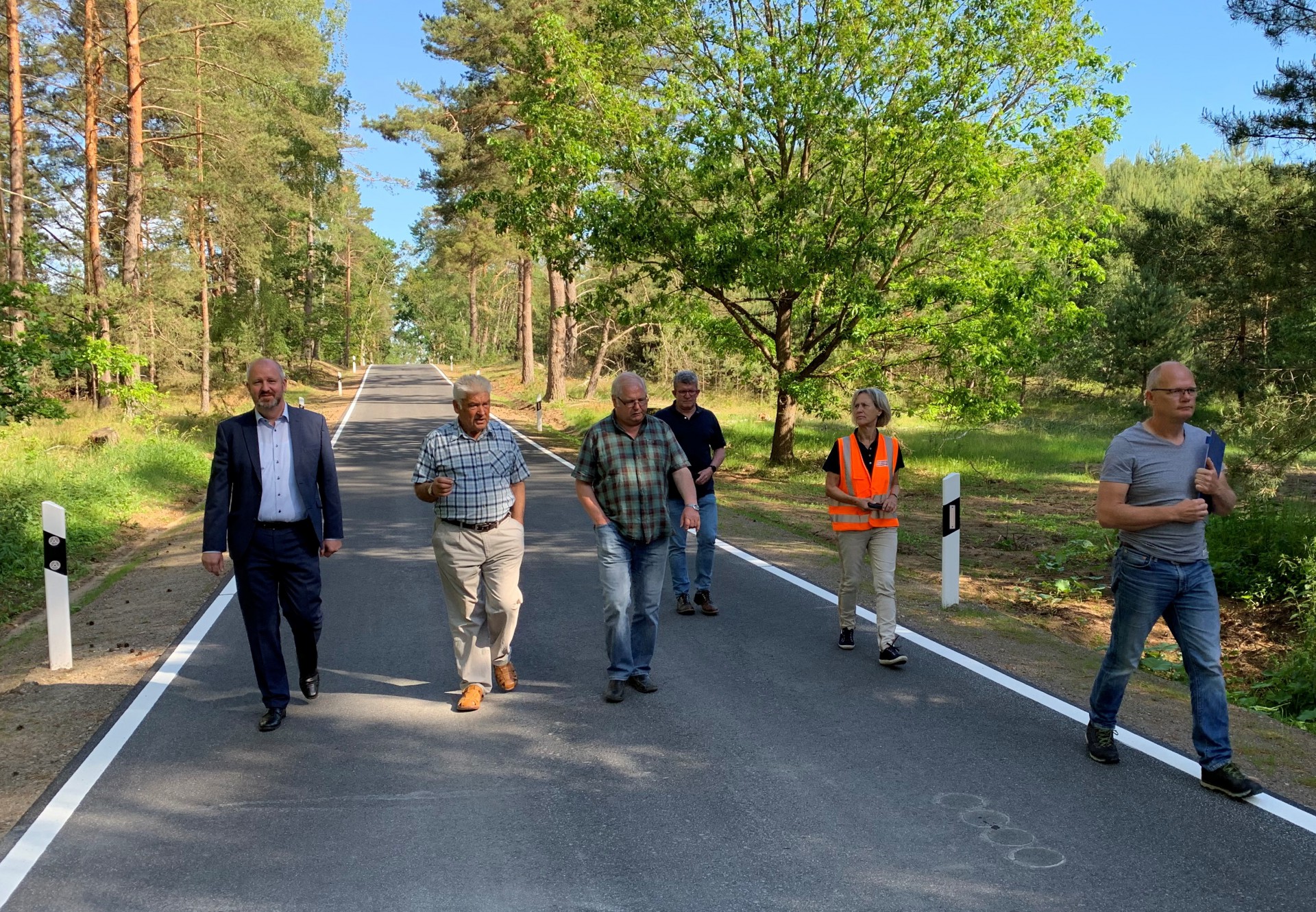 Die Kreisstraße MSE 90 vom Abzweig Inselhotel Brückentinsee in Richtung Lychen bis zur Landesgrenze nach Brandenburg ist gestern für den Verkehr freigegeben worden. Der zuständige Beigeordnete Torsten Fritz und Bürgermeister Manfred Marczok (auf dem Foto v.l.) haben gemeinsam mit Vertretern der Baufirma Strabag und des Planungsbüros, dem Ingenieurbüro Klaeser & Partner, einen Teil der neuen Straße abgeschritten und begutachtet.