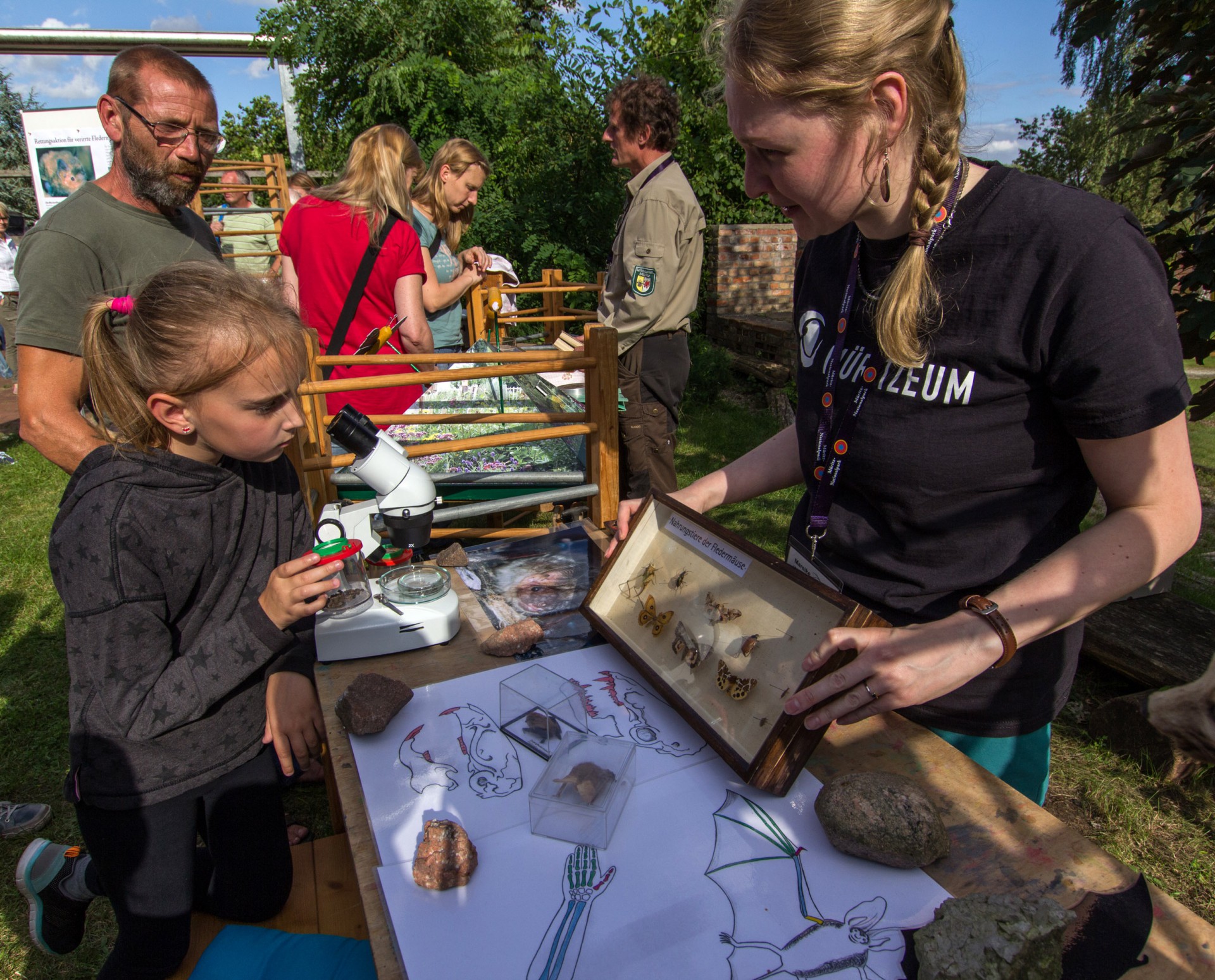 Foto im Text: Mareike Wauer aus dem Müritzeum präsentiert Falter und Schmetterlinge – die Nahrungsquelle der Fledermäuse (Foto: N. Künkler, NPA Müritz)