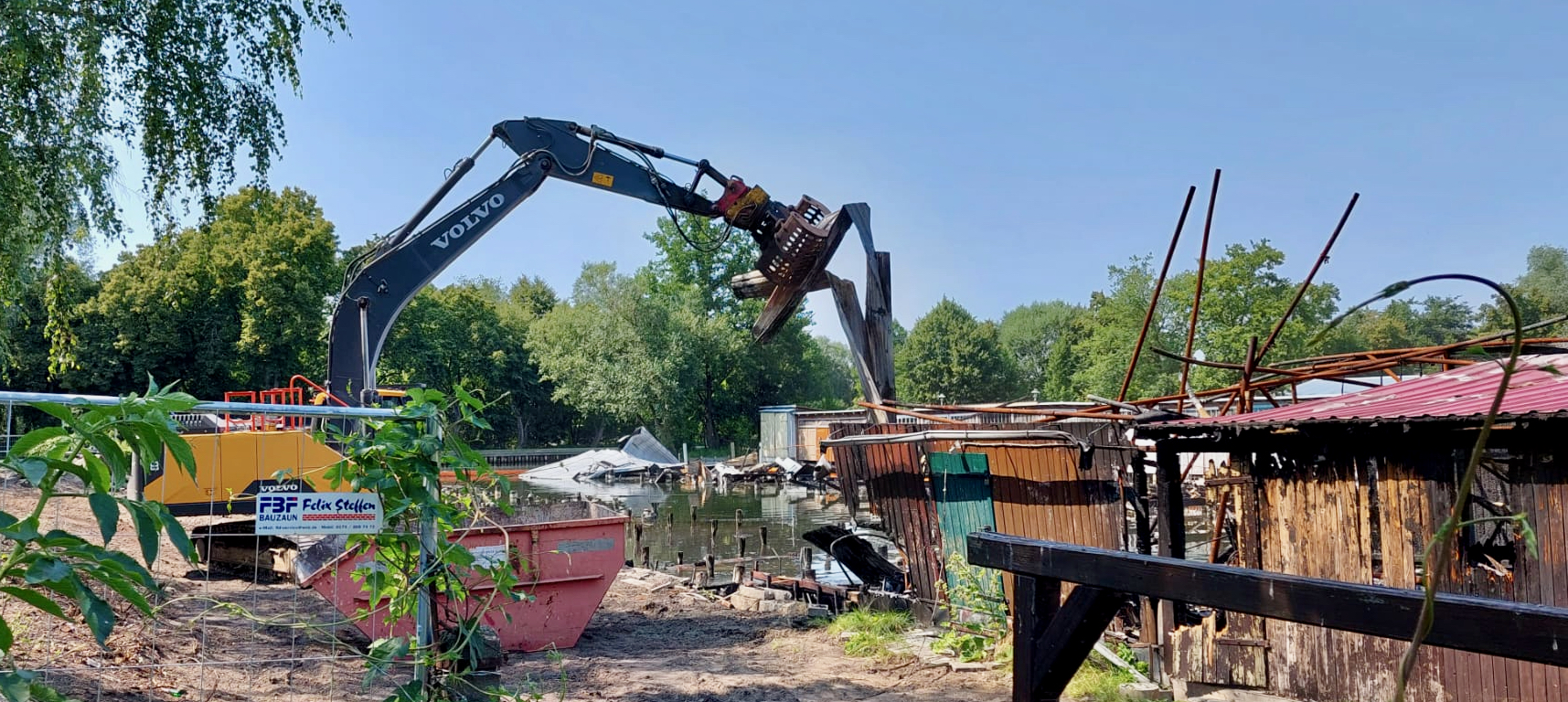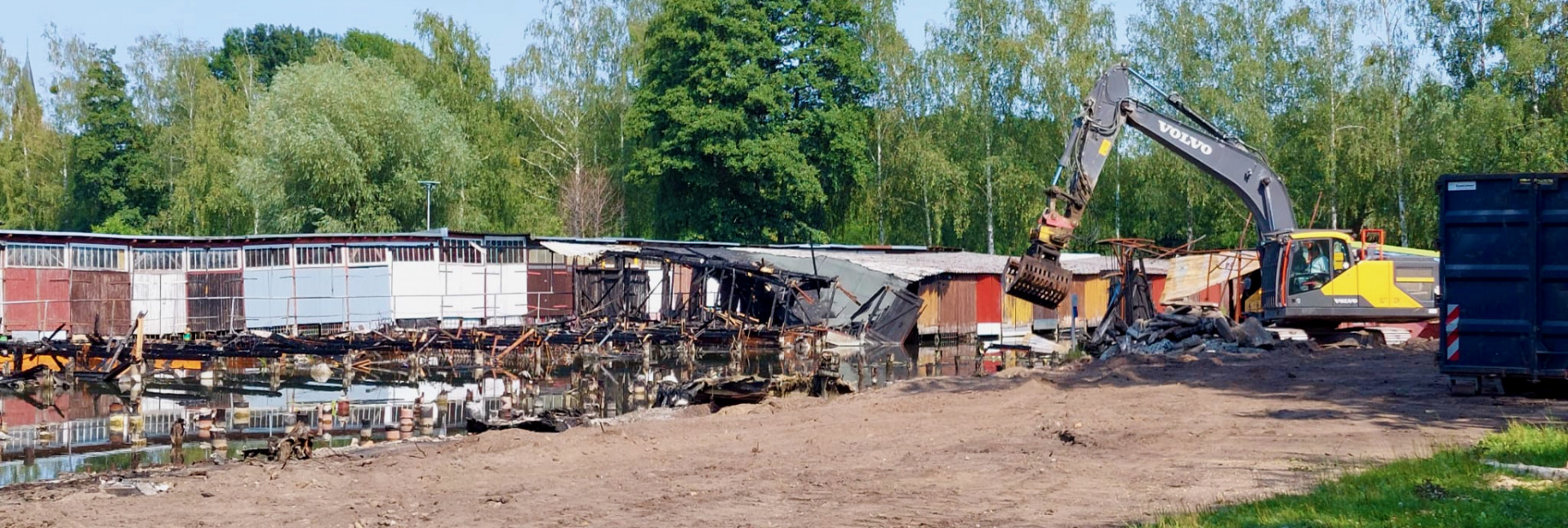 Nach dem Großbrand in der Bootsschuppen-Anlage Anfang Mai in Neubrandenburg haben endlich auch dort Aufräumarbeiten begonnen. Ein Bagger hat in dieser Woche verkohlte Holzbalken und Trennwände, aber auch Metalldächer und andere Reste „gefunden“, gehoben und in die jeweils passenden Container geworfen. Drei verschiedene Behälter wurden hinter Bauzäunen hingestellt. Nach und nach werden zudem weitere Reste, wie Kunststoffe, abgeräumt, wenn sie von oben greifbar scheinen. Neben den zerstörten Schuppenreihen wurde zudem ein Haufen Rasen abgetragen, weil der mit Asbestfasern von Asbest-Dachplatten verschmutzt war. Für diese Anfangsarbeiten werden etwa 40 000 Euro an Kosten veranschlagt. Diese will die Stadt zunächst auslegen und später Pächtern in Rechnung stellen.