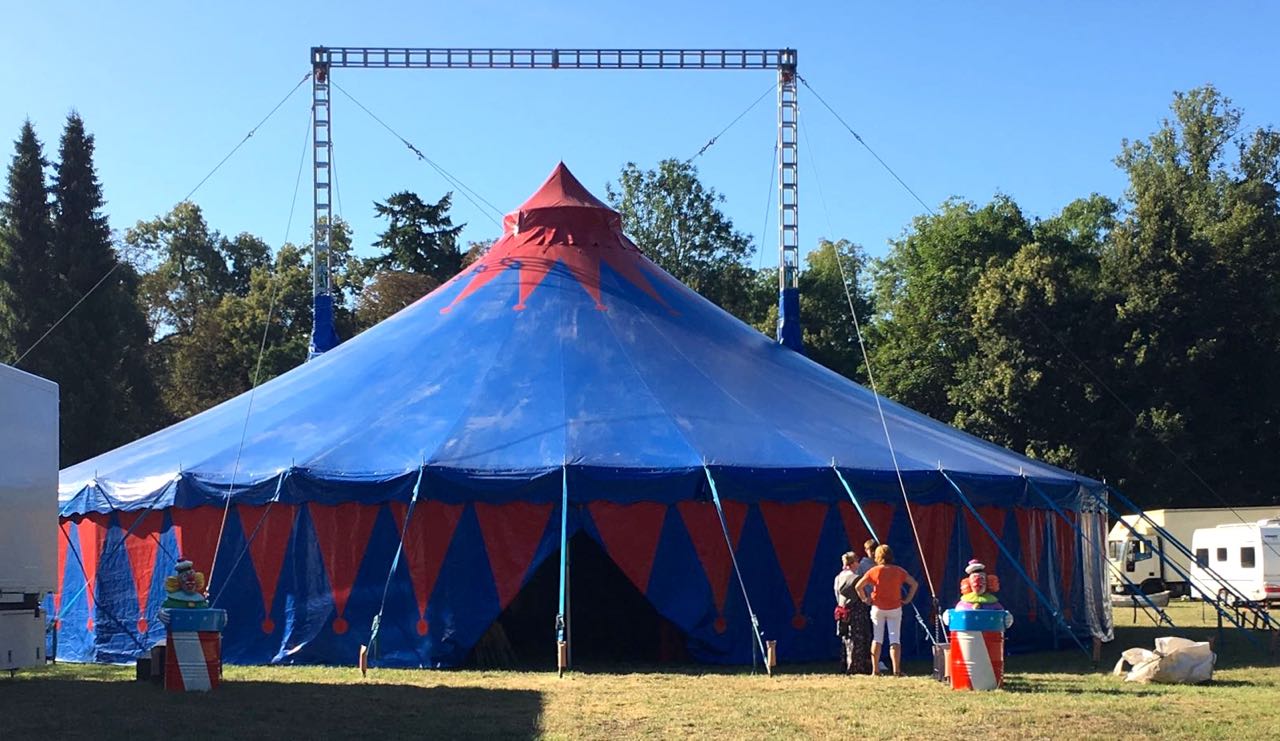 In diesem Zelt haben die Schüler der Peeneschule in Groß Gievitz heute und morgen ihren großen Auftritt. Denn für die Mädchen und Jungen begann die Schule nach den Sommerferien gleich turbulent mit einem Zirkusprojekt.