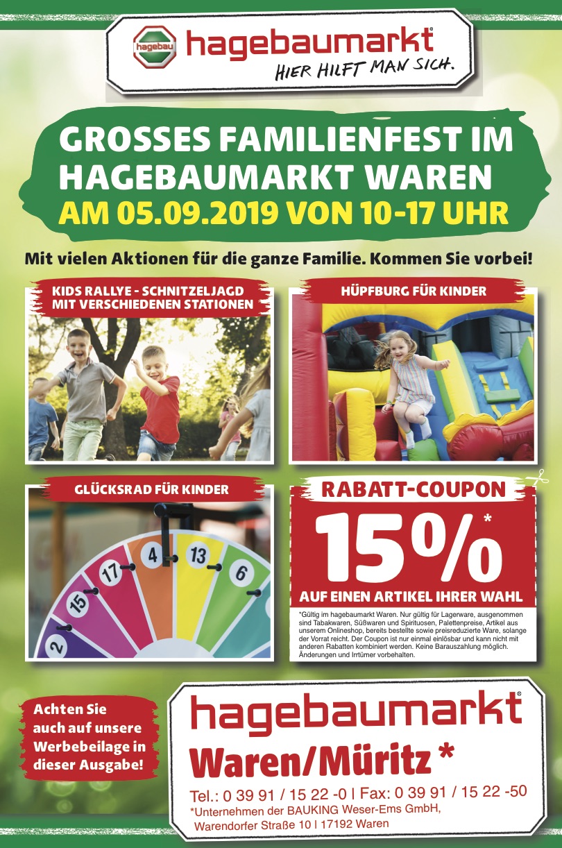 Mit einem kleinen Fest sind die neuen „Werke“ gestern mit den Helfern und Eltern eingeweiht worden. Heute laden Warens Hagebaumarkt-Chef Sebastian Hartwig und seine Mitarbeiter alle Müritzer zum Feiern ein. Von 10 bis 17 Uhr gibt’s direkt am Markt viele Aktionen, das Programm haben wir am Ende dieses Artikel veröffentlicht.