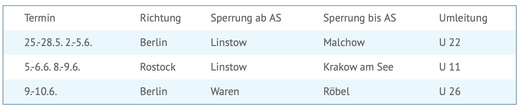 Ab kommenden Montag wird stellenweise die Fahrbahn an der A19 zwischen den Anschlussstellen (AS) Linstow und Röbel ausgebessert. Dafür muss der Verkehr zeitweise umgeleitet werden. Um ihn so wenig wie möglich zu beeinträchtigen, erfolgen die Arbeiten ausschließlich nachts zwischen 19 und 6 Uhr.