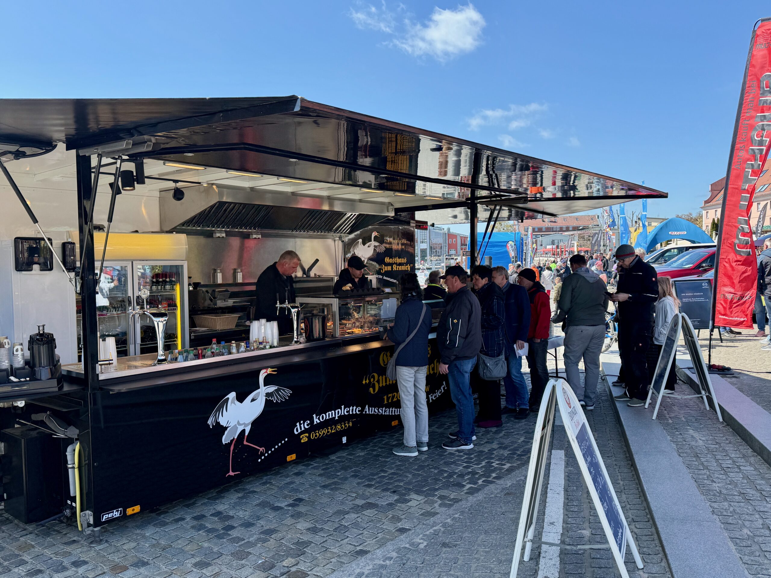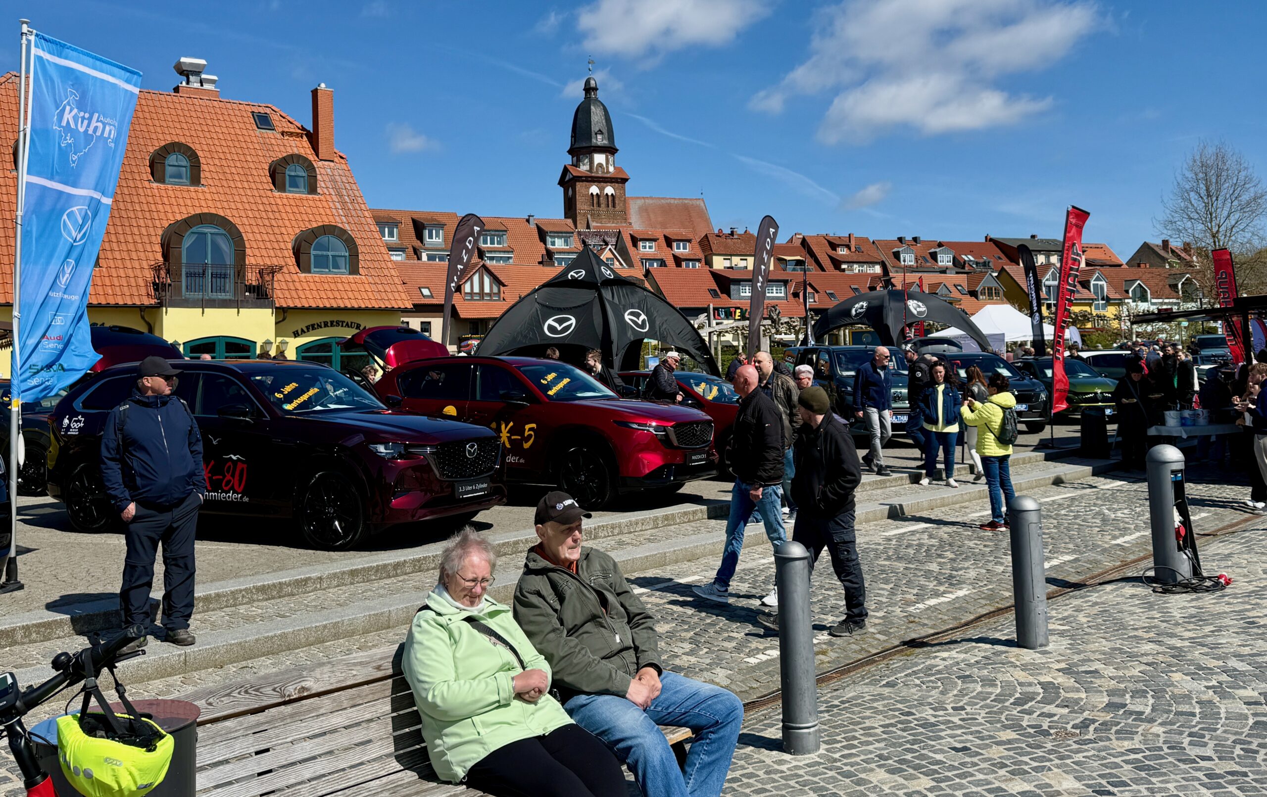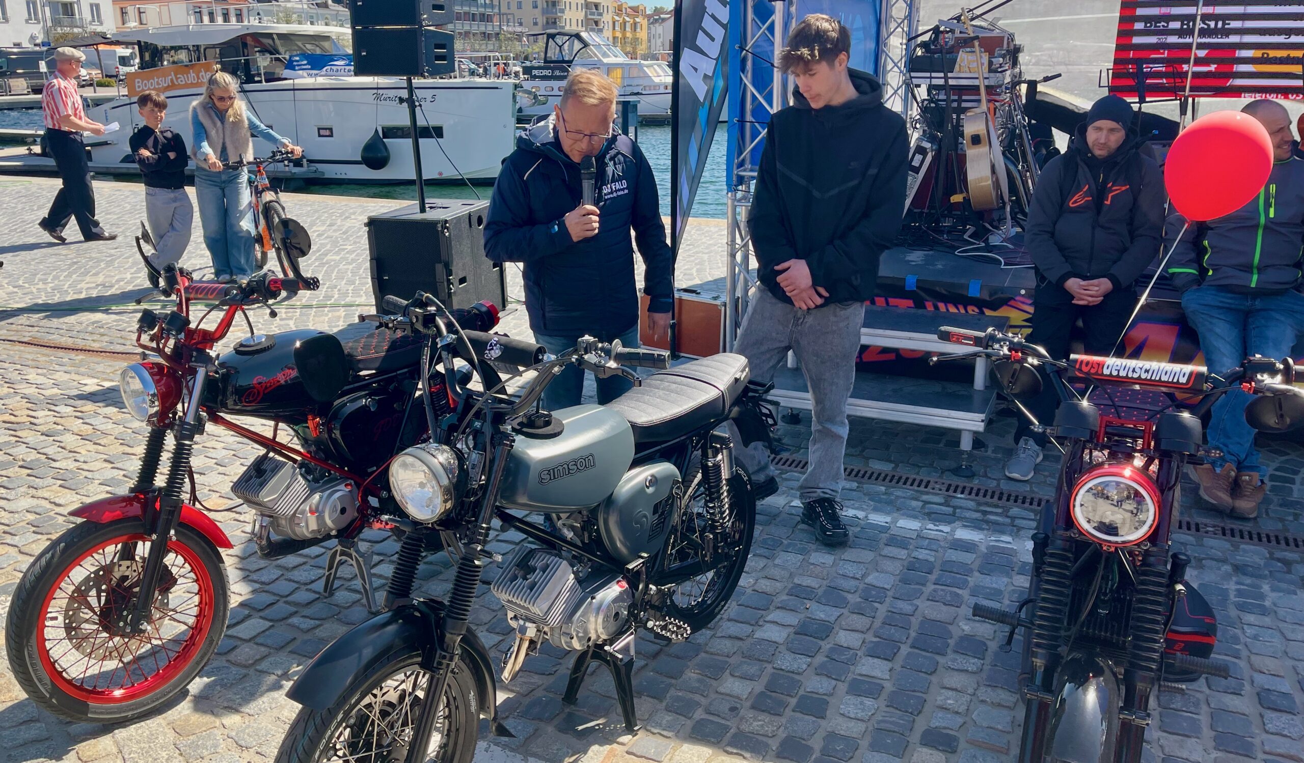 Sie gehört zum Frühling an der Müritz wie die blühenden Kirschbäume und die Boote, die wieder im Hafenwasser liegen: Die Automesse. Die hat auch gestern wieder zahlreiche Besucher angezogen. Bei herrlichem Sonnenschein, aber doch kräftigem Wind schauten sie sich die neuesten Modelle an, verglichen Preise, ließen sich von den Verkäufern erklären, wie die viele Technik in den Wagen funktioniert und wurden nebenbei auch noch gut unterhalten. Auch einige historische Mopeds und Motorräder rollten auf den Platz. Davon hätte sich Veranstalter Olaf Gaulke zwar ein paar mehr gewünscht, doch der Anfang ist gemacht, im kommenden Jahr werden’s sicher mehr. Zumal das Interesse der Besucher groß war. Denn hier und da kamen schon Jugenderinnerungen auf, vor allem bei den Simson-Modellen. Für die Aussteller gab’s zu Belohnung einen geräucherten Saibling von den Müritzfischer.