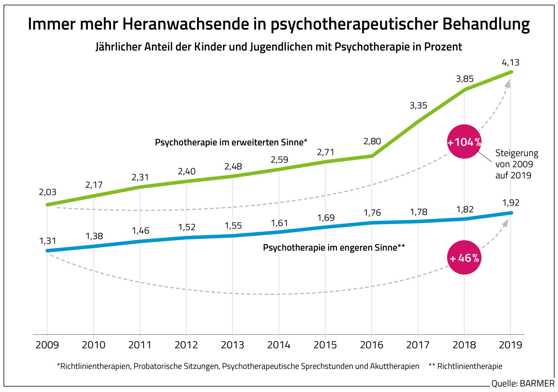 Immer mehr Kinder und Jugendliche in Deutschland sind in psychotherapeutischer Behandlung. Innerhalb von elf Jahren hat sich die Zahl der jungen Patienten mehr als verdoppelt. Das geht aus dem aktuellen Arztreport der BARMER hervor, der gestern in Berlin vorgestellt wurde. Demnach benötigten im Jahr 2019 rund 823.000 Kinder und Jugendliche psychotherapeutische Hilfe, 104 Prozent mehr als im Jahr 2009. Die Corona-Pandemie samt strikter Kontaktbeschränkungen dürfte dabei die Situation noch ein Stück weit verschärfen.