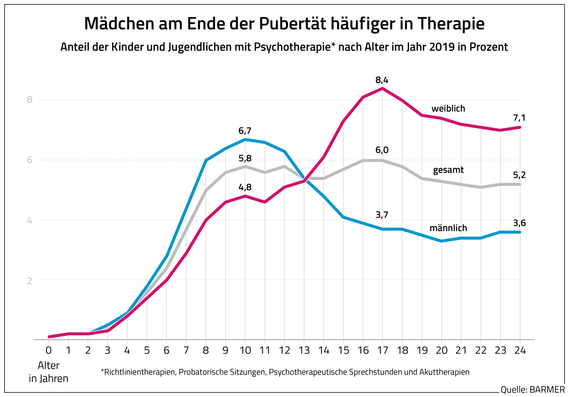 Wie aus dem Arztreport weiter hervorgeht, gibt es deutliche regionale Unterschiede bei der Inanspruchnahme psychotherapeutischer Leistungen. Am größten war im Jahr 2019 demnach der Bedarf in Berlin mit 5,19 Prozent aller Kinder und Jugendlichen, gefolgt von Nordrhein-Westfalen und Hessen. Den geringsten Anteil verzeichnete Mecklenburg-Vorpommern mit 3,33 Prozent aller jungen Menschen. Allerdings war hier die Steigerungsrate bei der Inanspruchnahme seit dem Jahr 2009 mit 239 Prozent am größten, gefolgt von Sachsen-Anhalt und Brandenburg.