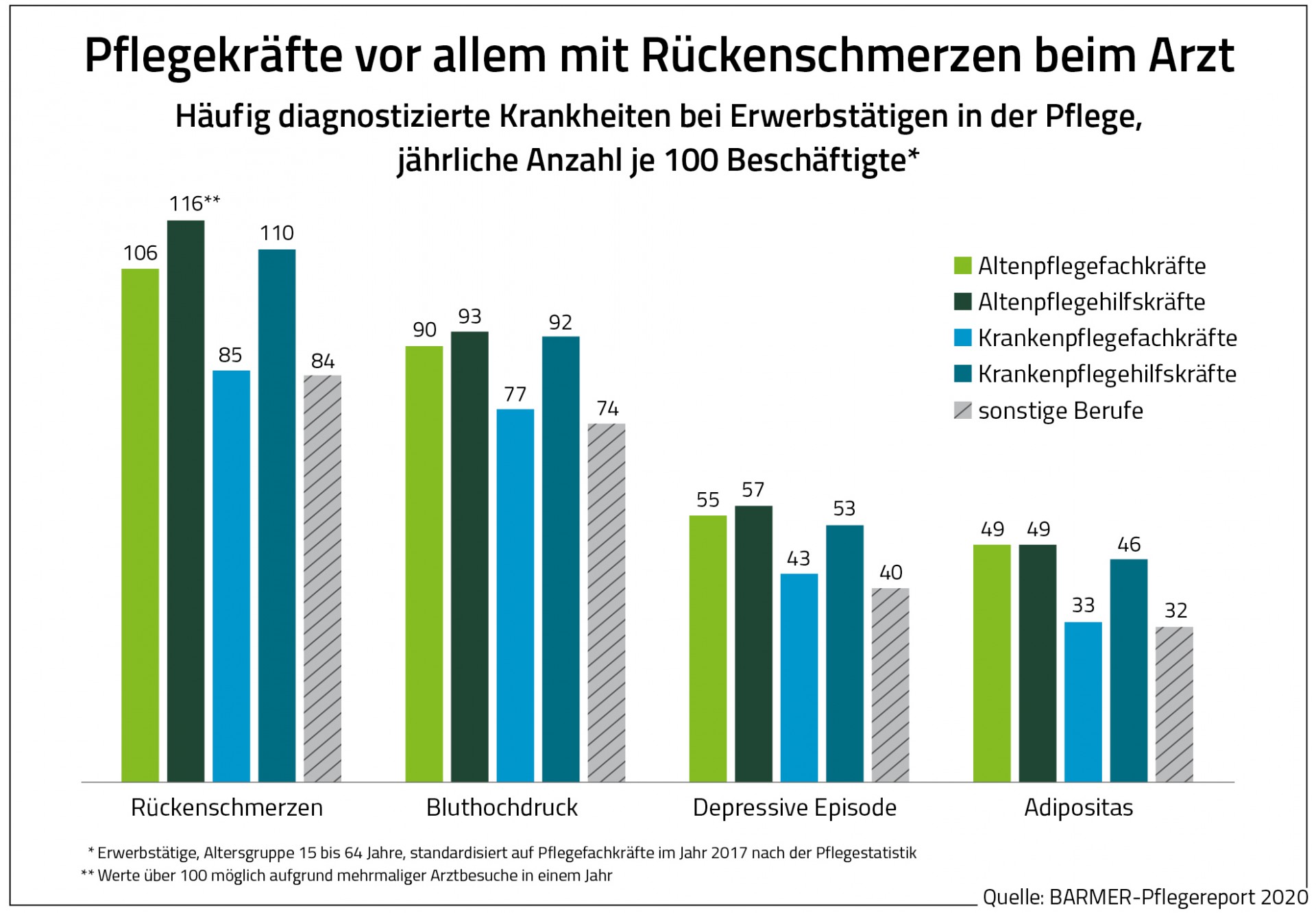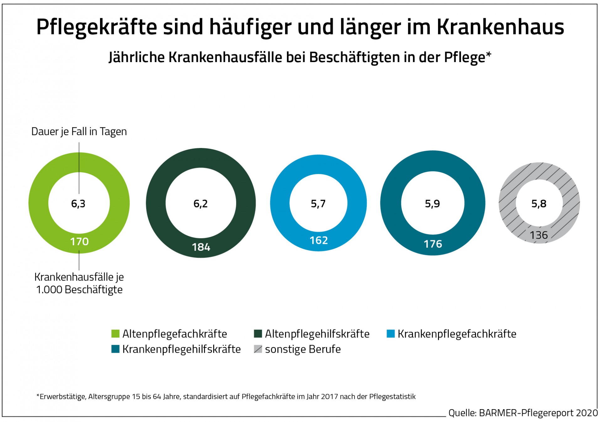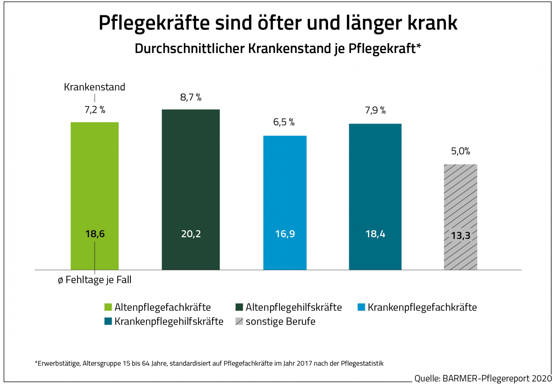 Zwischen den Jahren 2016 und 2018 waren den Ergebnissen des Pflegereports zufolge 8,7 Prozent aller Hilfskräfte und 7,2 Prozent der Fachkräfte in der Altenpflege krankgeschrieben. In anderen Berufen lag der Krankenstand im Schnitt bei 5,0 Prozent. Das entspricht einem Unterschied von bis zu 73 Prozent. Zudem müssen Pflegekräfte häufiger und länger im Krankenhaus behandelt werden als andere Erwerbstätige.