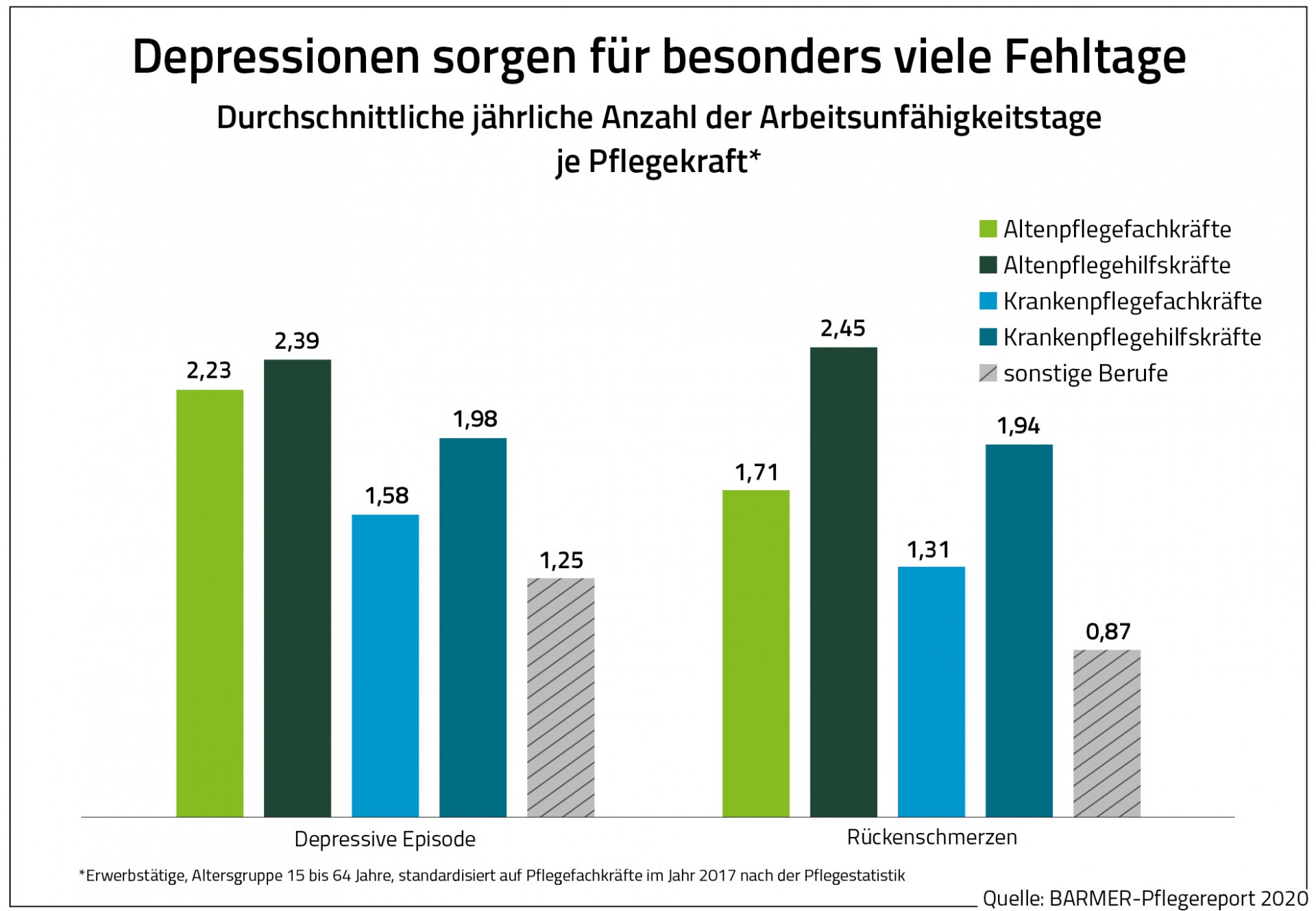 Wie groß der Handlungsbedarf in der Pflege ist, verdeutlicht der Pflegereport auch mit Blick auf den Krankenstand. So fehlte jede krankgeschriebene Altenpflegefachkraft in den Jahren 2016 bis 2018 im Schnitt 18,6 Tage und damit 40 Prozent länger als Beschäftigte in sonstigen Berufen (13,3 Fehltage). Altenpflegehilfskräfte waren sogar im Schnitt 20,2 Tage krank. „Pflegekräfte haben vor allem lange Fehlzeiten aufgrund von psychischen Problemen sowie Muskel-Skelett-Erkrankungen“, sagte Studienautor Prof. Dr. Heinz Rothgang von der Universität Bremen. So wiesen Beschäftigte in der Altenpflege etwa 80 bis 90 Prozent mehr Fehltage aufgrund von Depressionen auf als Erwerbstätige in sonstigen Berufen.