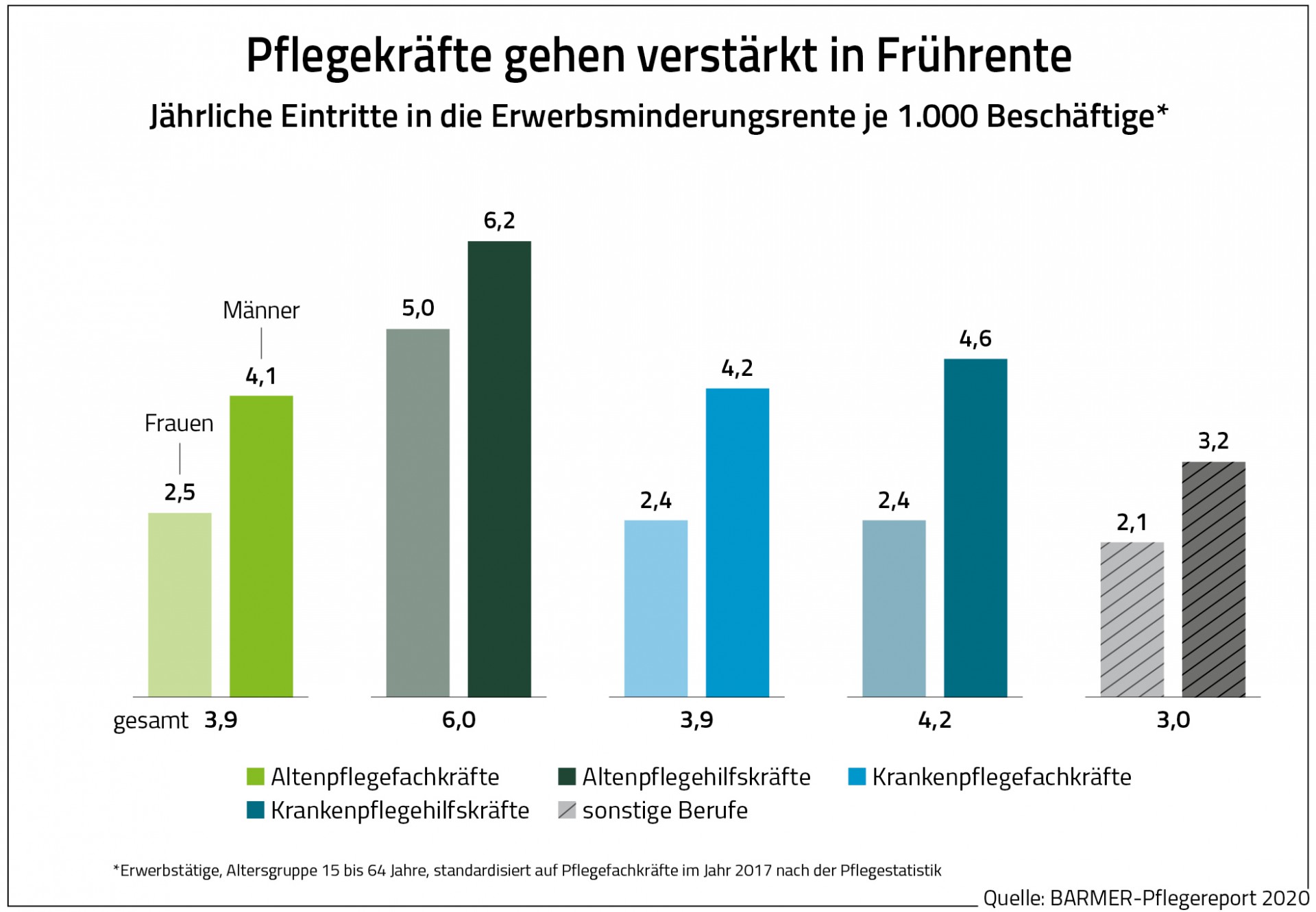 Die Arbeitssituation in der Pflege greift die Gesundheit der Beschäftigten massiv an. Wenn sie ausfallen, werden Kollegen zusätzlich belastet. Dieser Teufelskreis muss durchbrochen werden, zumal die Corona-Pandemie die angespannte Arbeitssituation der Pflegekräfte noch einmal verschärft“, betonte Straub. Der Pflegeberuf sei so kraftraubend, dass zudem überproportional viele Beschäftigte nicht bis zur Rente durchhielten. So sei der Anteil der Pflegekräfte mit einer Erwerbsminderungsrente bis zu doppelt so hoch wie in sonstigen Berufen.